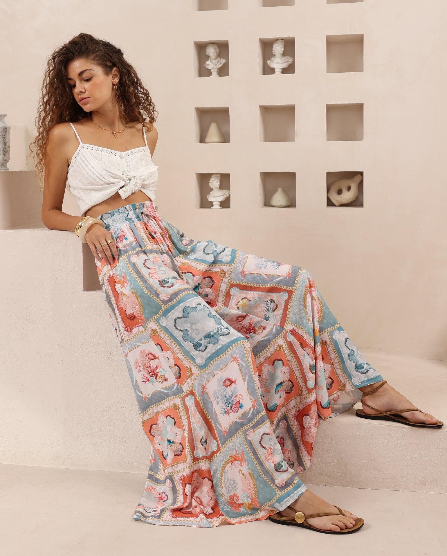 The Ariel Pant are a fun design, that will become your go-to! They are a breezy fit in a light weight fabrication, showcasing an abstract 'seashell' print in shades of coral, aqua and butter. High waisted in nature that feature a thick elasticised waist band and draw string. Full length, exaggerated wide leg design with side pockets. Pair back with our white Newtown Top to complete the look!