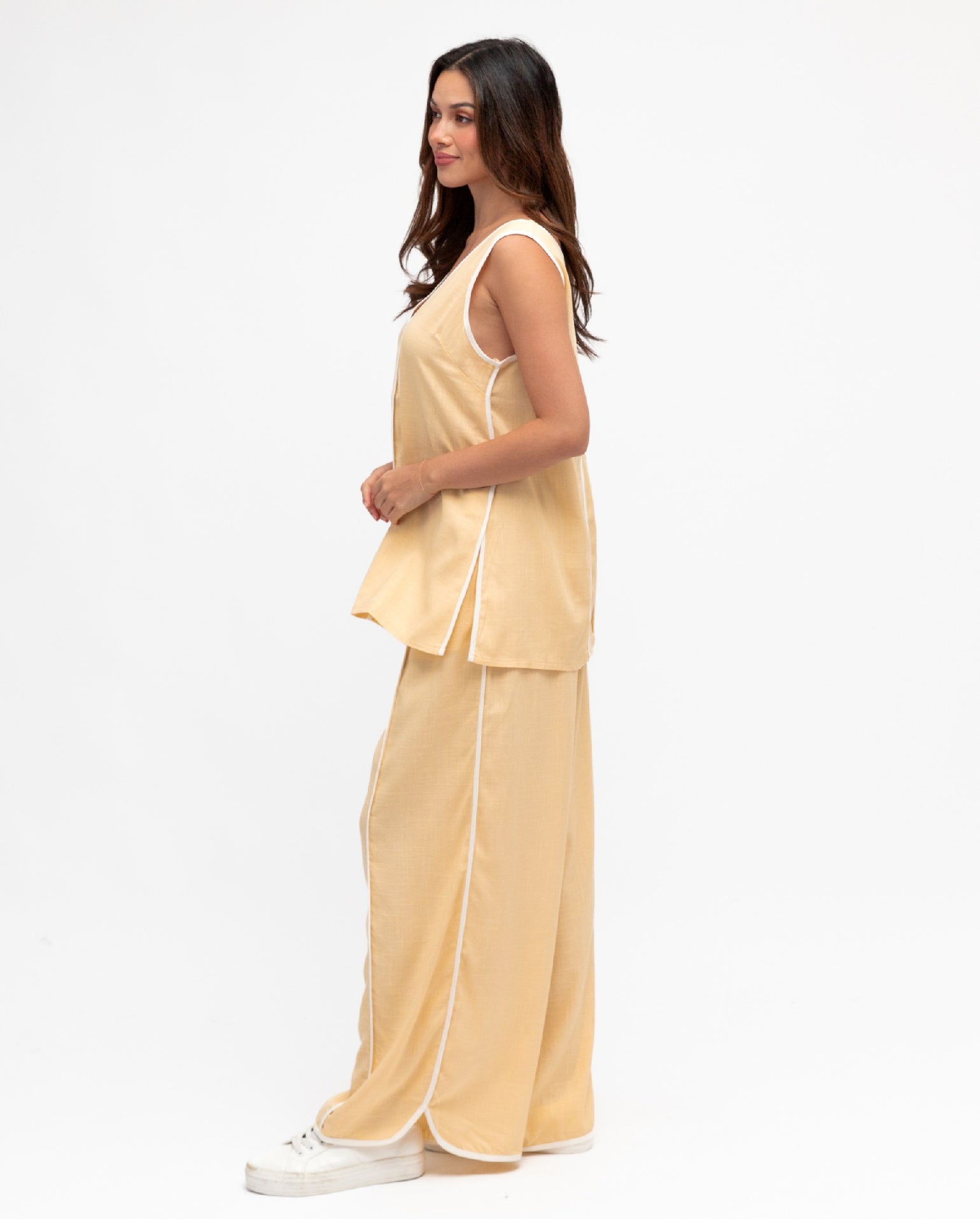 The Astra Pant are a classic design, that will keep you on trend! They are a breezy fit in a linen blend fabrication, showcasing a soft butter hue and a white piping detail throughout. High waisted in nature that feature side pockets and an elasticised waist band and draw string. Full length, wide leg design with a curved hem. Pair back with our Astra Singlet Top to complete the look!