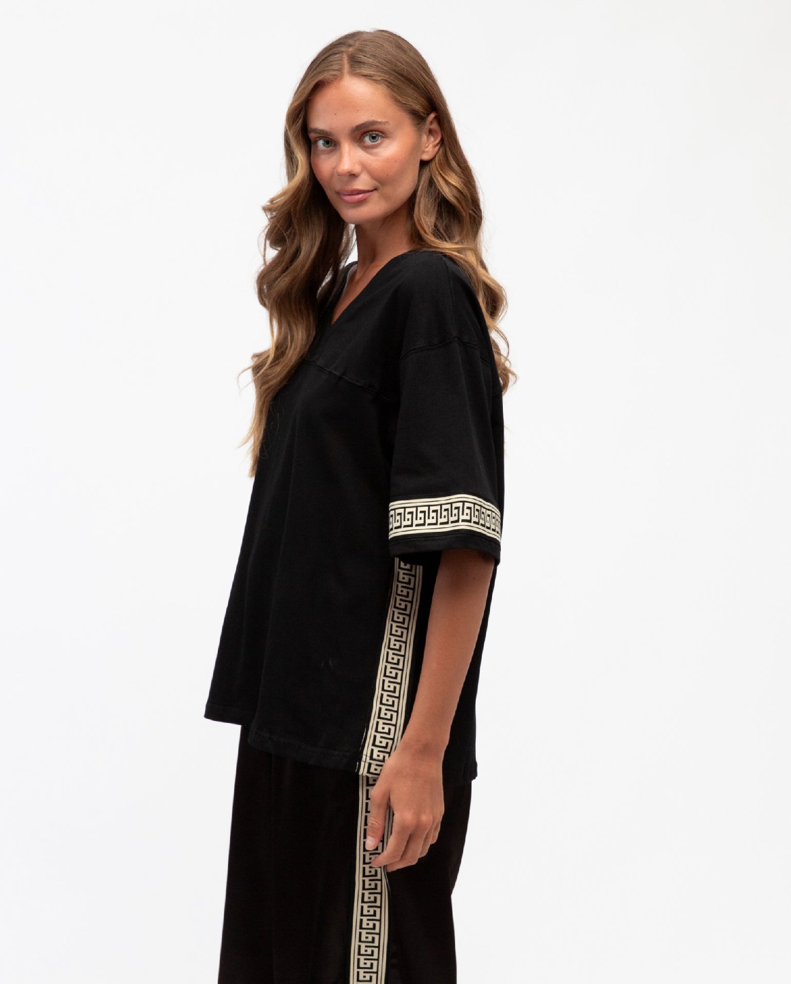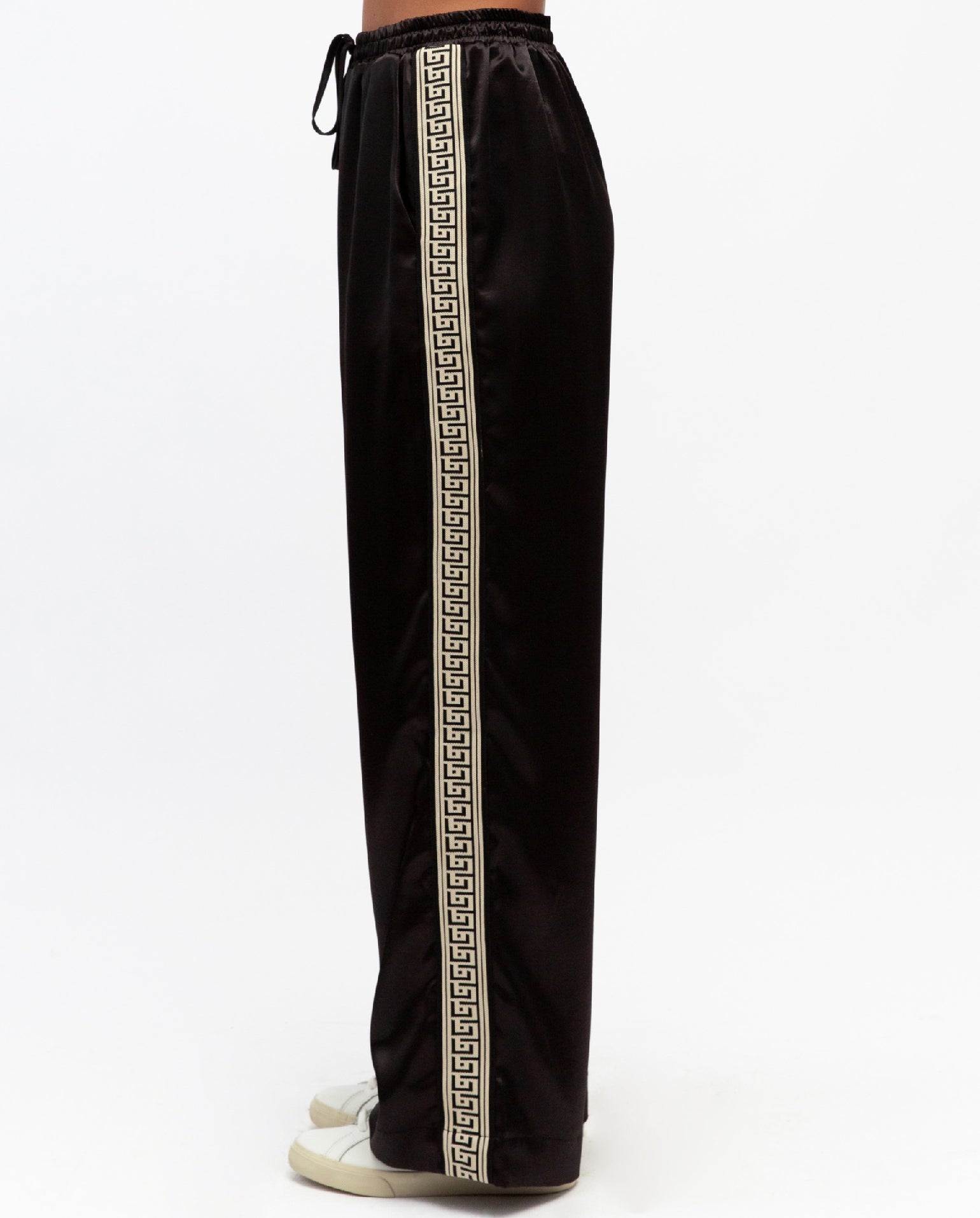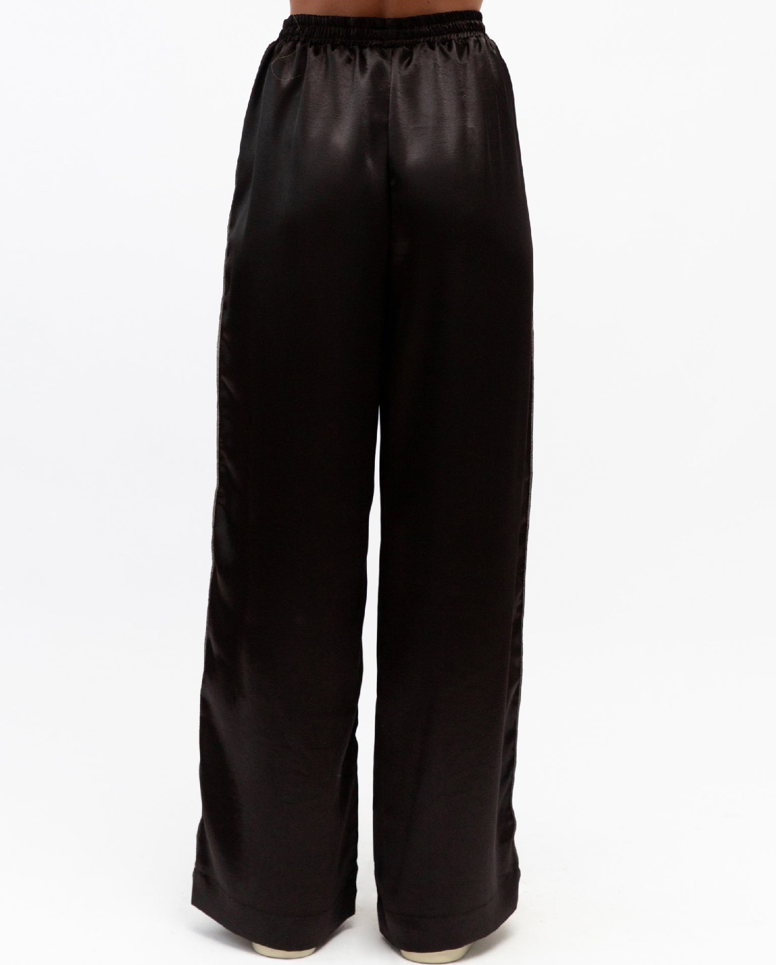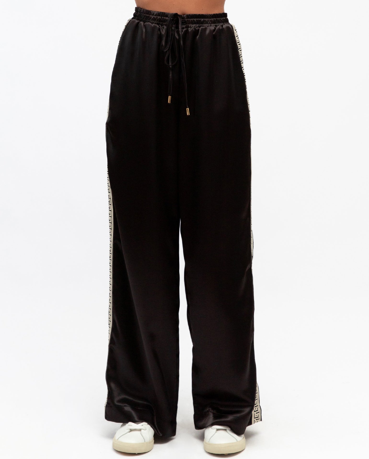 The Camryn Pant are a unique design, that will keep you on trend this Summer! They are finished in a satin look fabrication, showcasing a stunning black hue. High waisted in nature that feature an elasticised waistband and a drawstring throughout. Unique beige printed strip down the side seams. Full length, wide leg design. Pair back with our Camryn T-Shirt to complete the look.