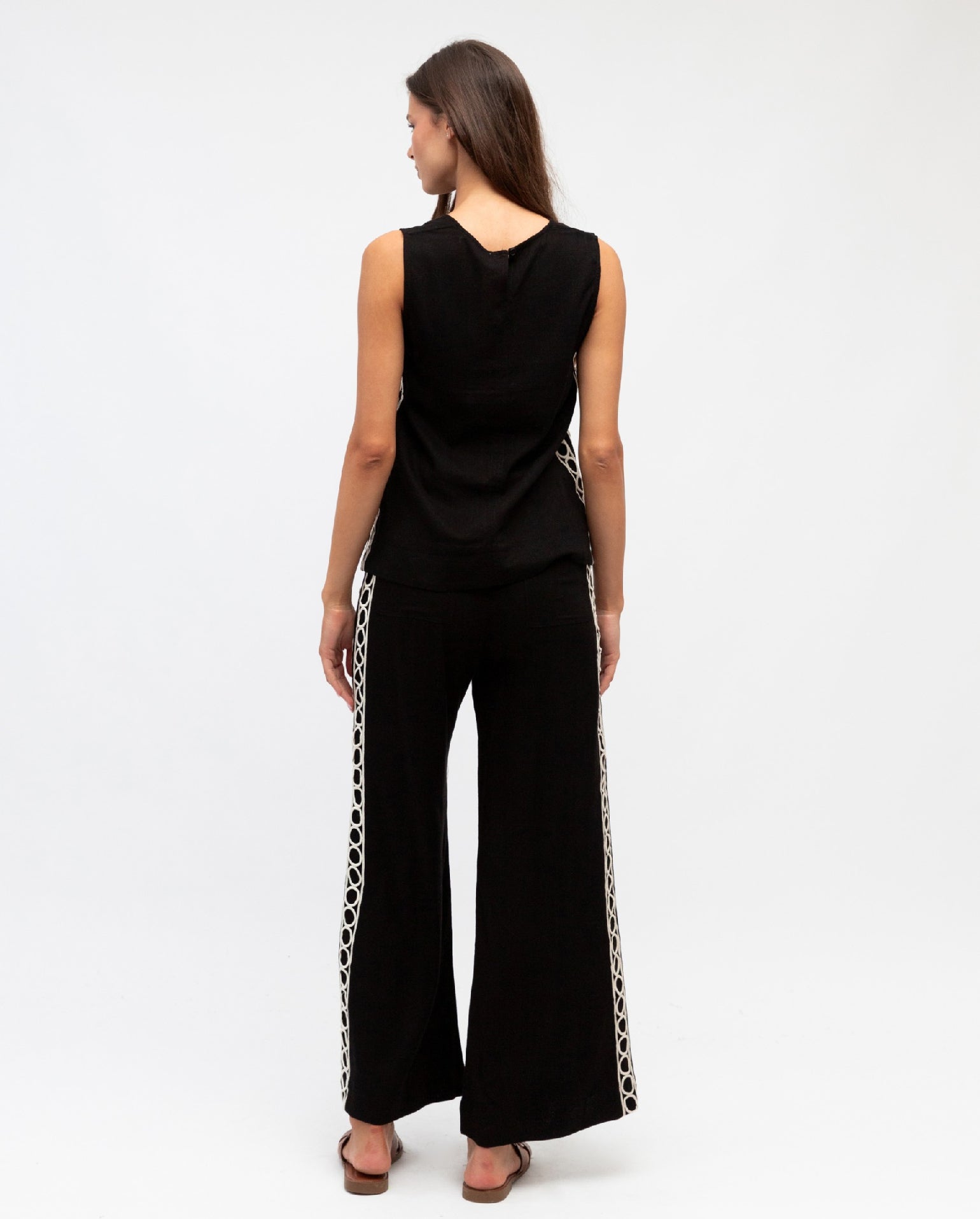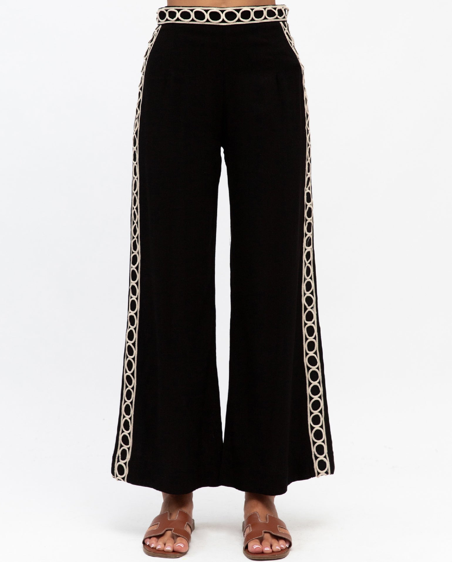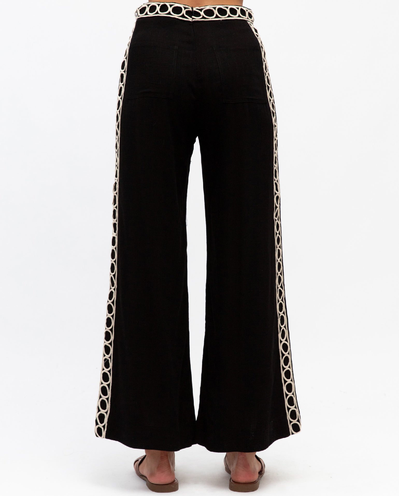 The Thea Pant are a classic design, that you'll wear all summer long! They are a breezy fit a linen blend, showcasing a deep black hue. Unique oatmeal lace trim found along waistband and side seams. High waisted in nature that feature a centre back invisible zip, back pockets and a medium sized waistband. Flat front design with darts. Full length, wide leg design. Pair back with our Thea Top to complete the look!