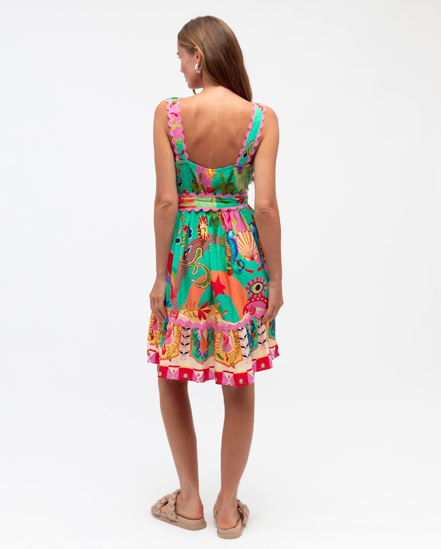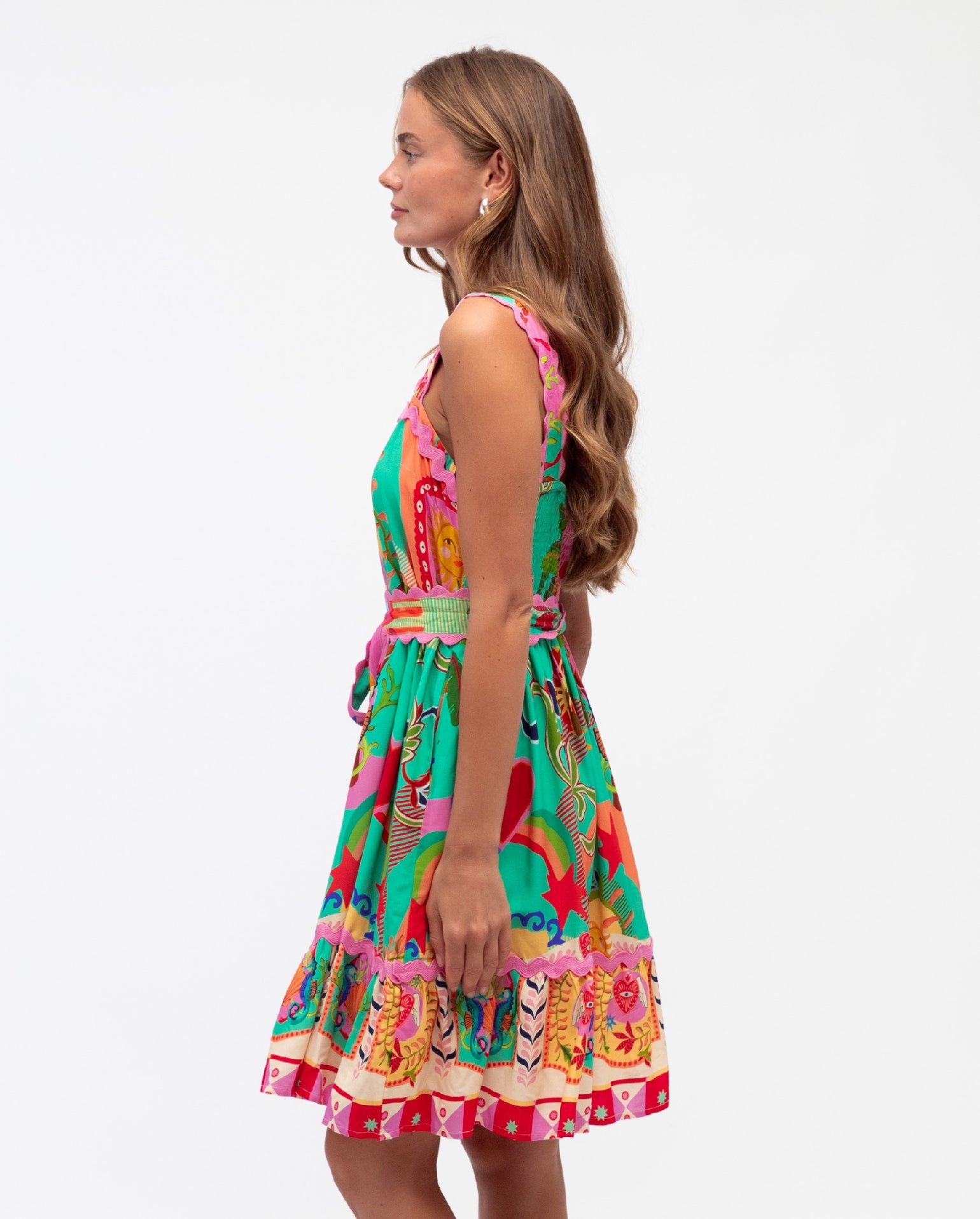 Say hello to the holiday season in our Carnival Short Dress! This dress features a square neckline, an elasticised back panel and is sleeveless in nature. Off body design that can be cinched in at the waist with the provided tie. Light weight fabrication that showcases a 'Carnival' inspired abstract print in shades of green, red, yellow and pink. Short length, tiered skirt design with side pockets. Unique ric rac trim detailing found throughout.