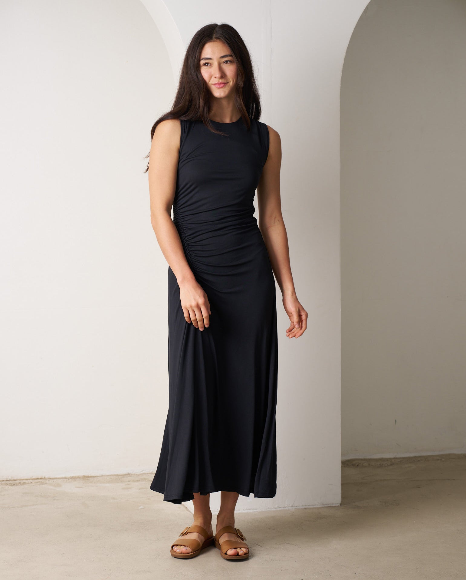 The Larisa Dress is super versatile, that will become your go to Summer piece! It features a round neckline and is sleeveless in nature. It is finished in a modal blend fabrication, showcasing a deep black hue. Body contour design that features ruching along the bodice and hipline, as well along the centre back. Midi length design with a straight hemline.