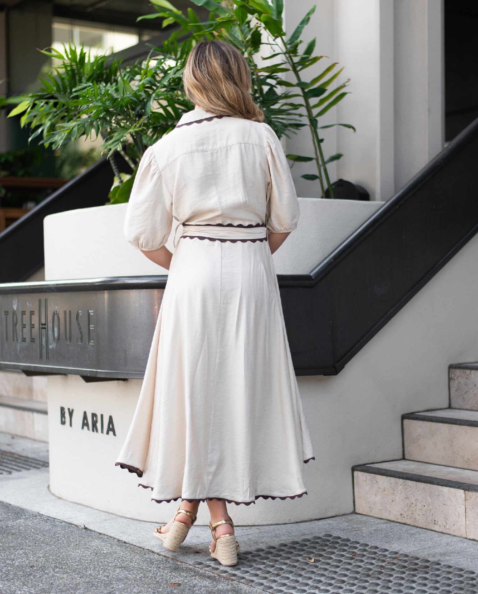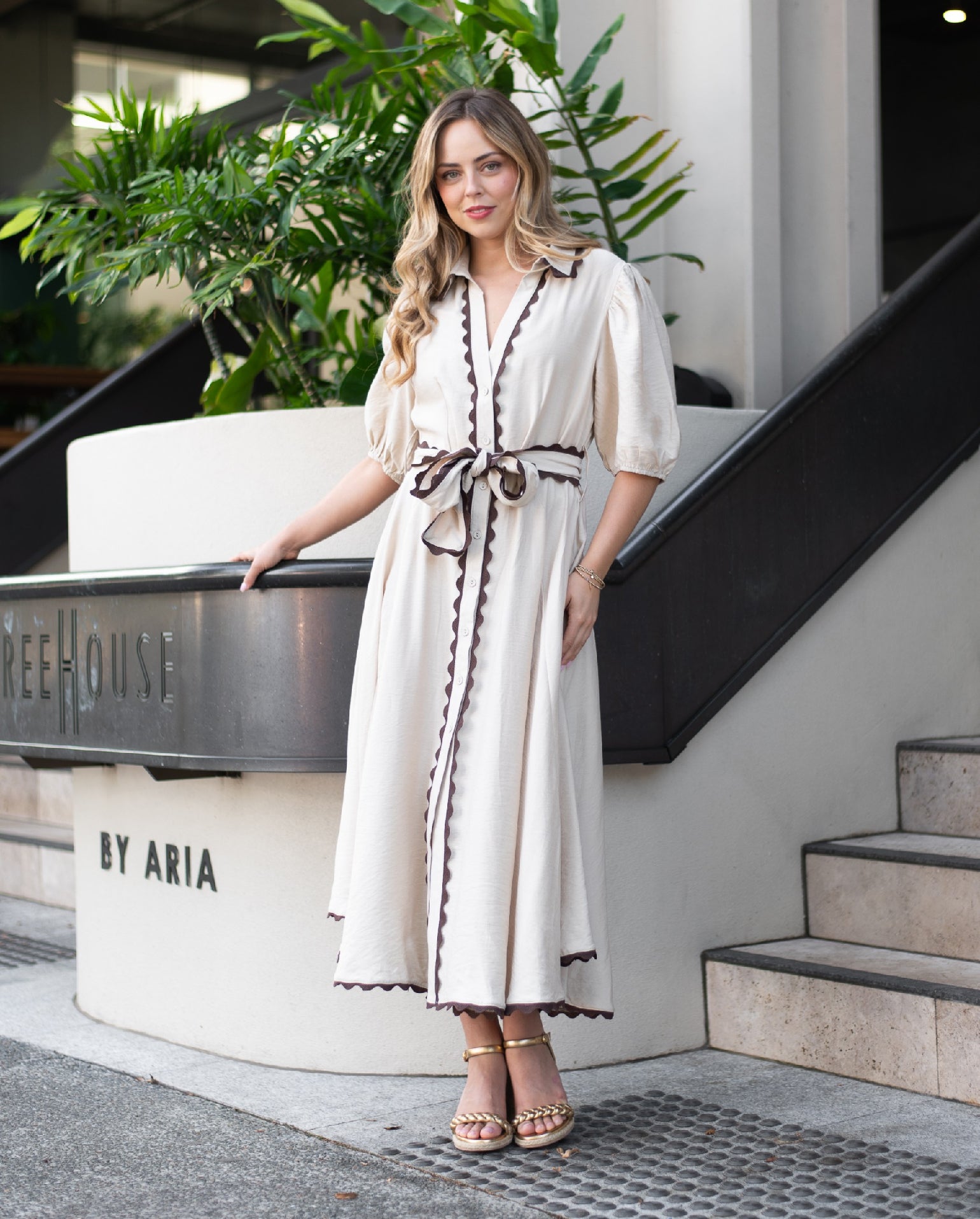 The Megan Dress is the perfect dress for the upcoming event season! It features a classic collar, a centre front button closure and short sleeves with elasticised cuffs. Viscose blend fabrication that showcases a stunning stone hue. Off body design in a midi length, that can be cinched in at the waist with the included belt. Unique chocolate ric rac trim detail found throughout.