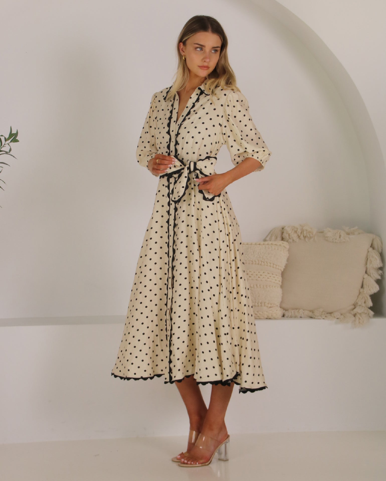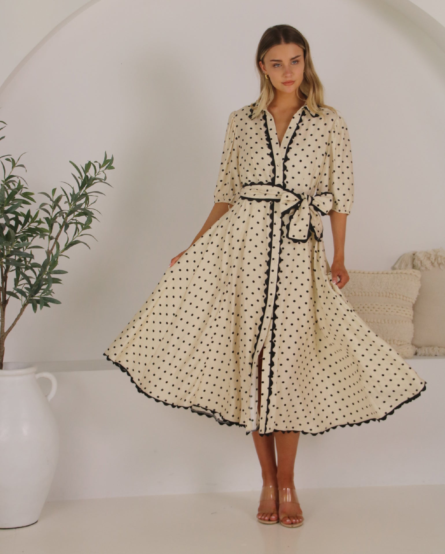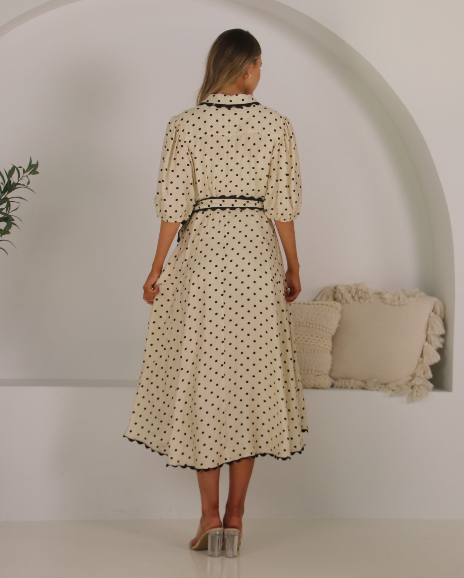 The Sonnet Dress is the perfect dress for the upcoming event season! It features a classic collar, a centre front button closure and short sleeves with elasticised cuffs. Viscose blend fabrication that showcases a stunning polka dot print in shades of black and cream. Off body design in a midi length, that can be cinched in at the waist with the included belt. Unique ric rac trim detail found throughout.