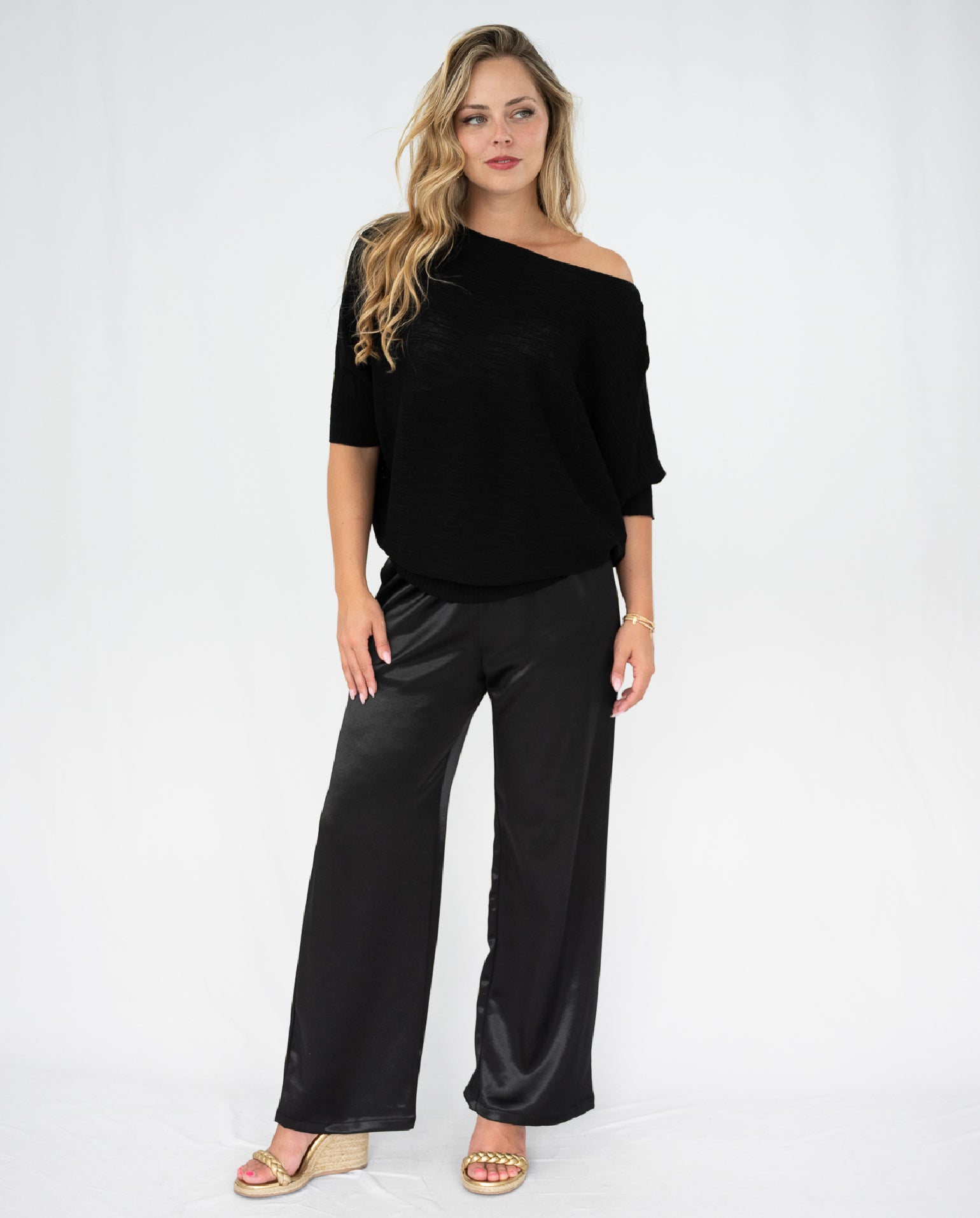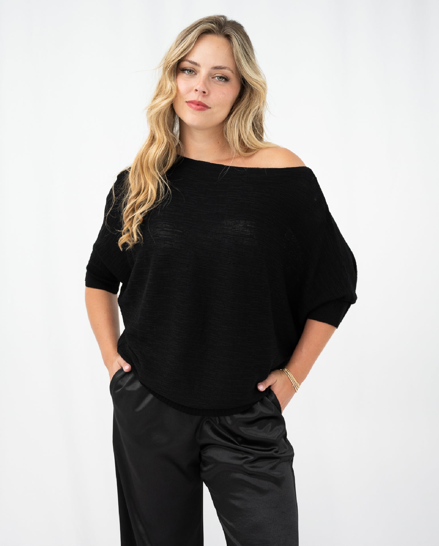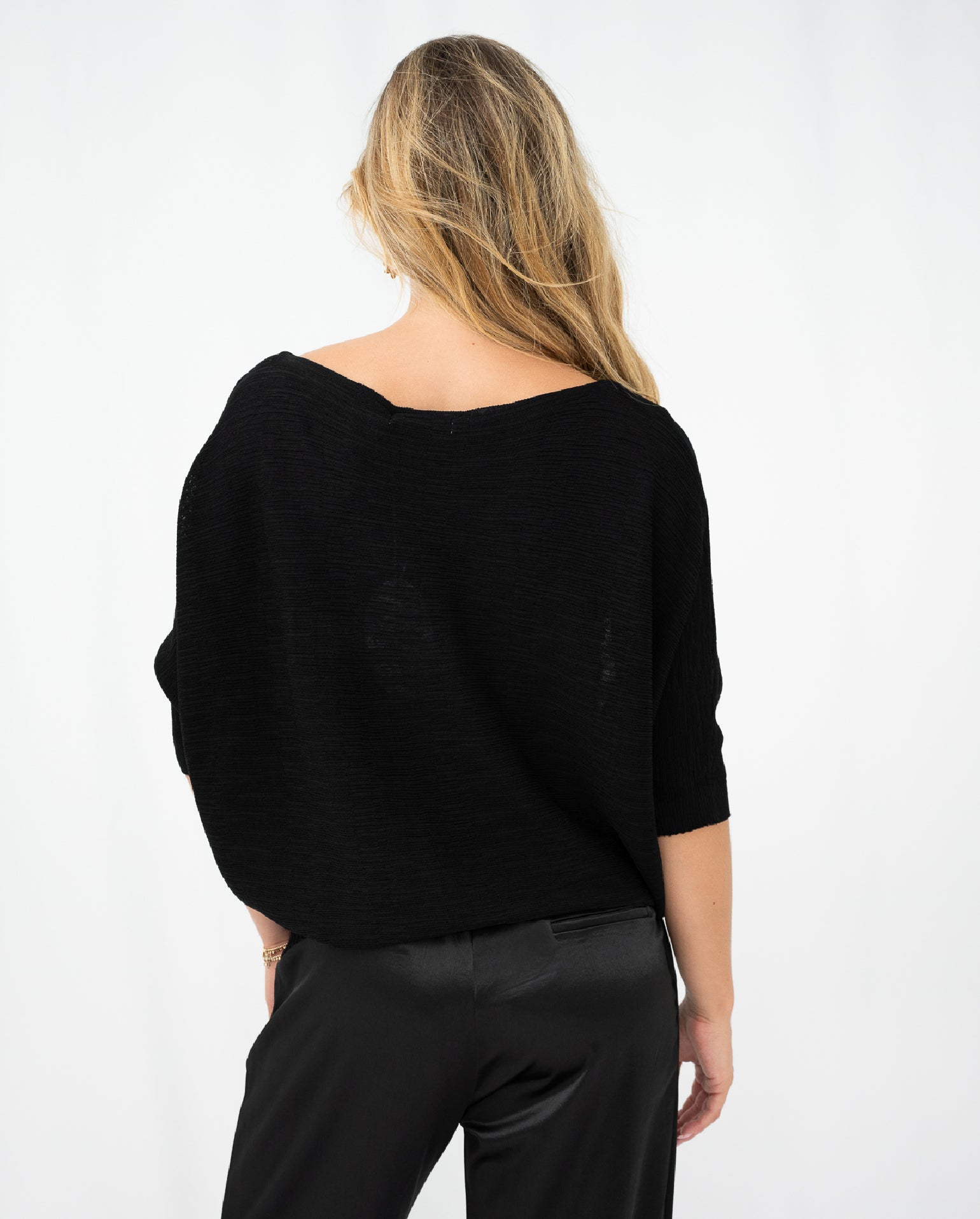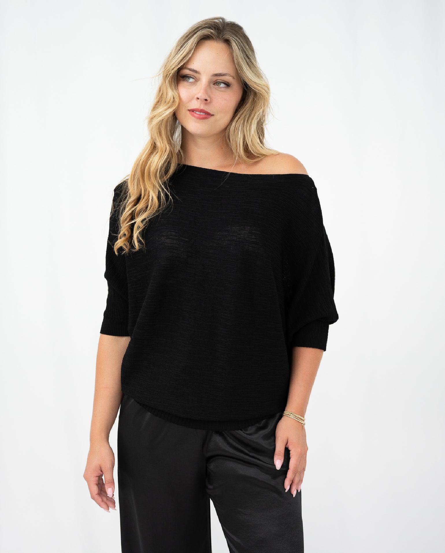 The Adam Knit Top is a minimal design, with so much versatility! It is finished in a textured knit fabrication, that showcases a deep black hue. Off body fit that has 3/4 bat wing sleeves and a cinched in straight hemline. Style on or off the shoulder!
