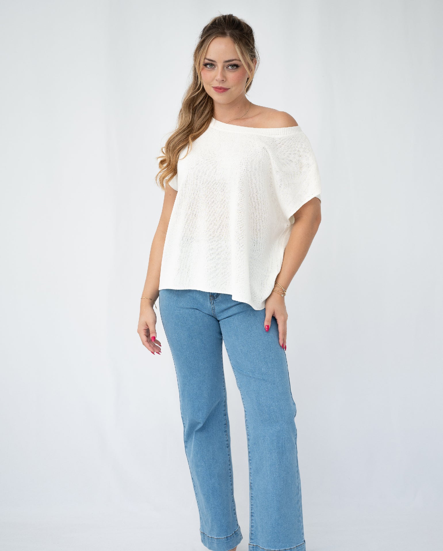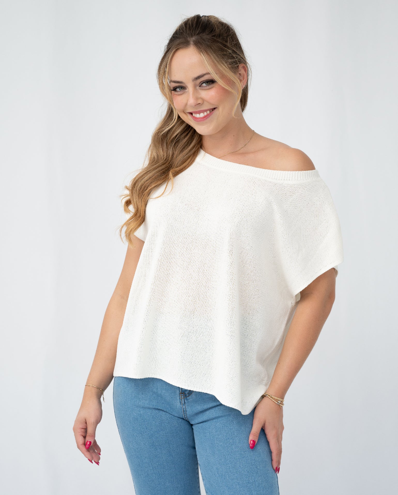 The Amoura Knit Top is a minimal design, with so much versatility! It is finished in a textured knit fabrication, that showcases a white snow hue. Off body fit that has a draped, one shoulder design. Pair back with a high waisted flare jean to complete the look!