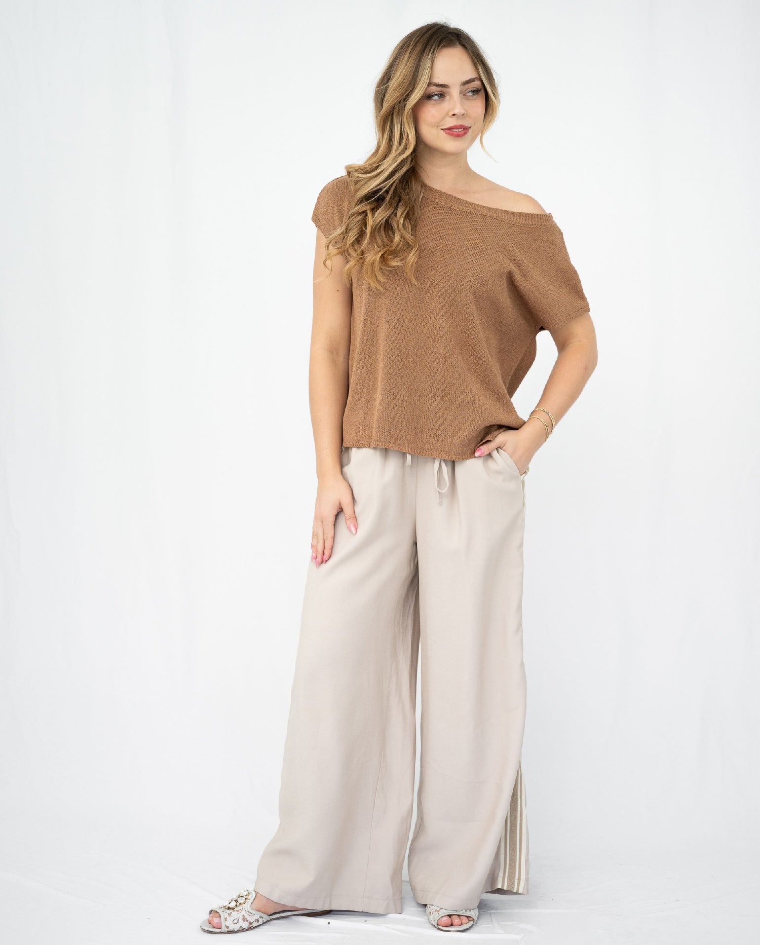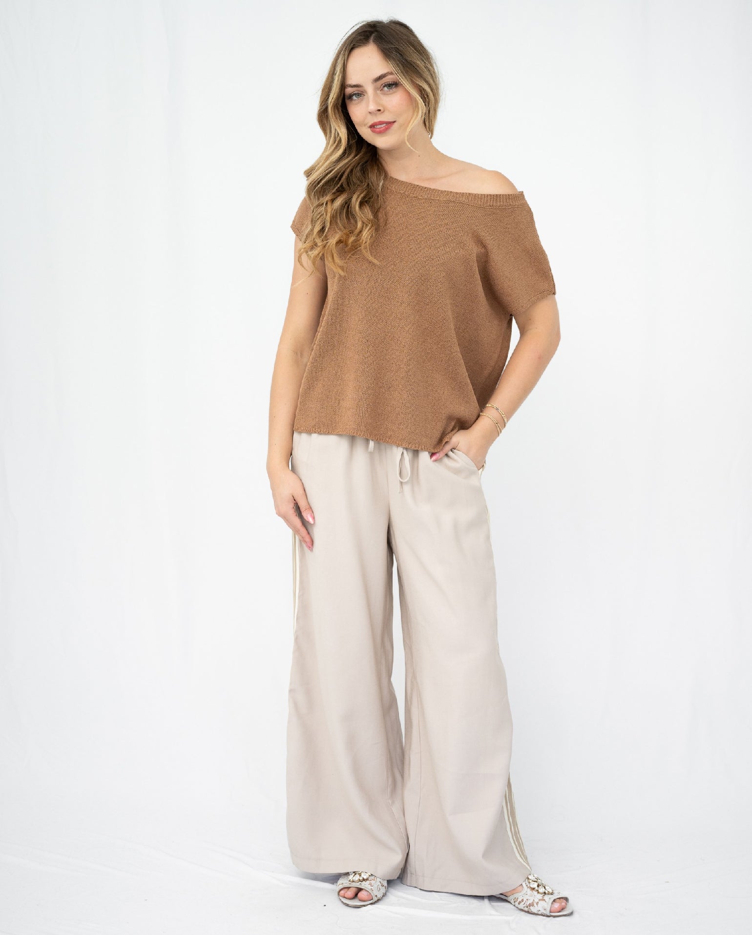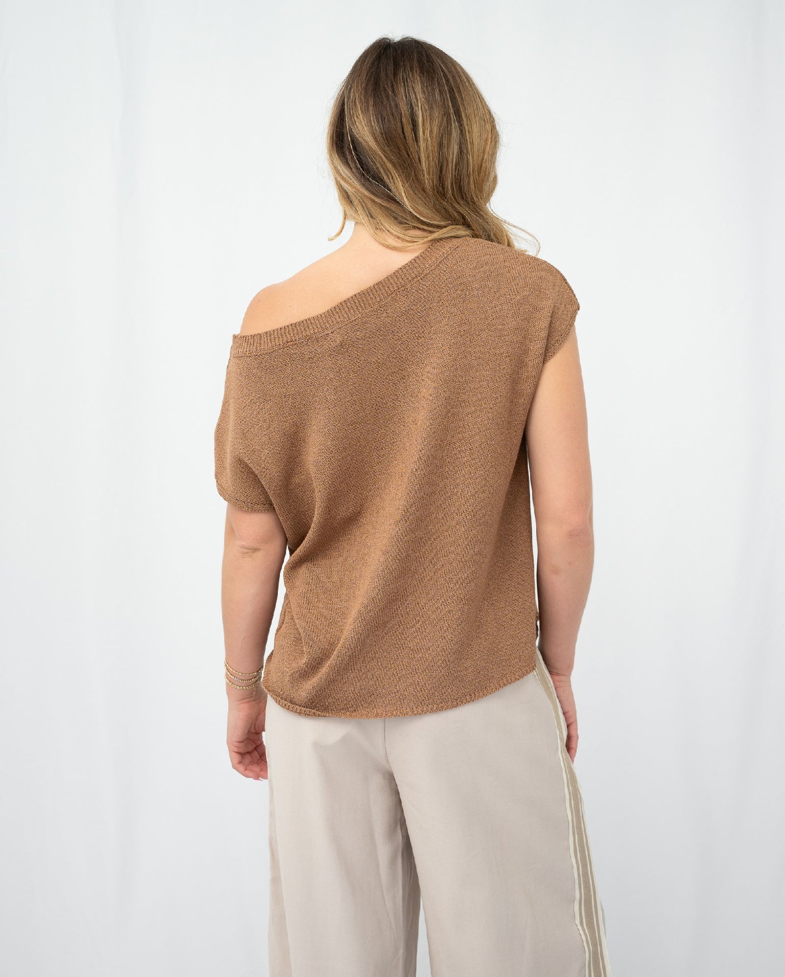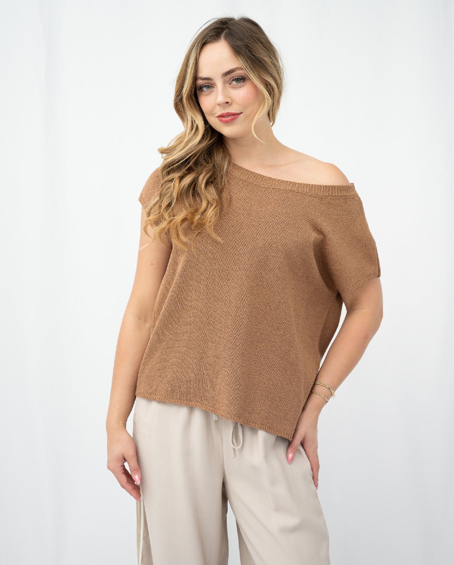 The Amoura Knit Top is a minimal design, with so much versatility! It is finished in a textured knit fabrication, that showcases a brown hue. Off body fit that has a draped, one shoulder design. Pair back with a high waisted flare jean to complete the look!