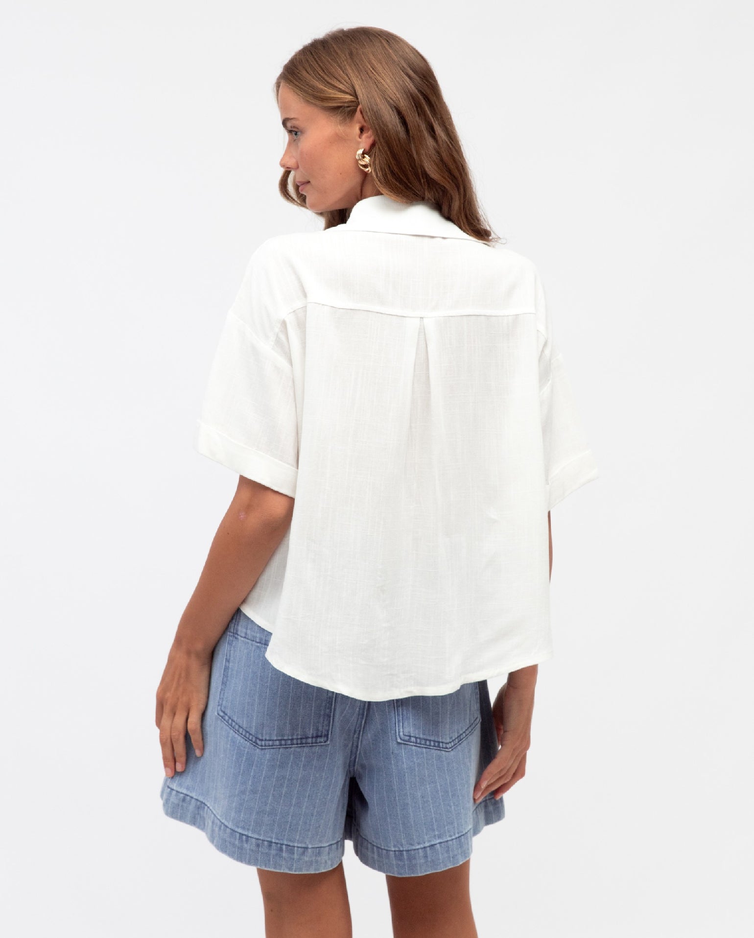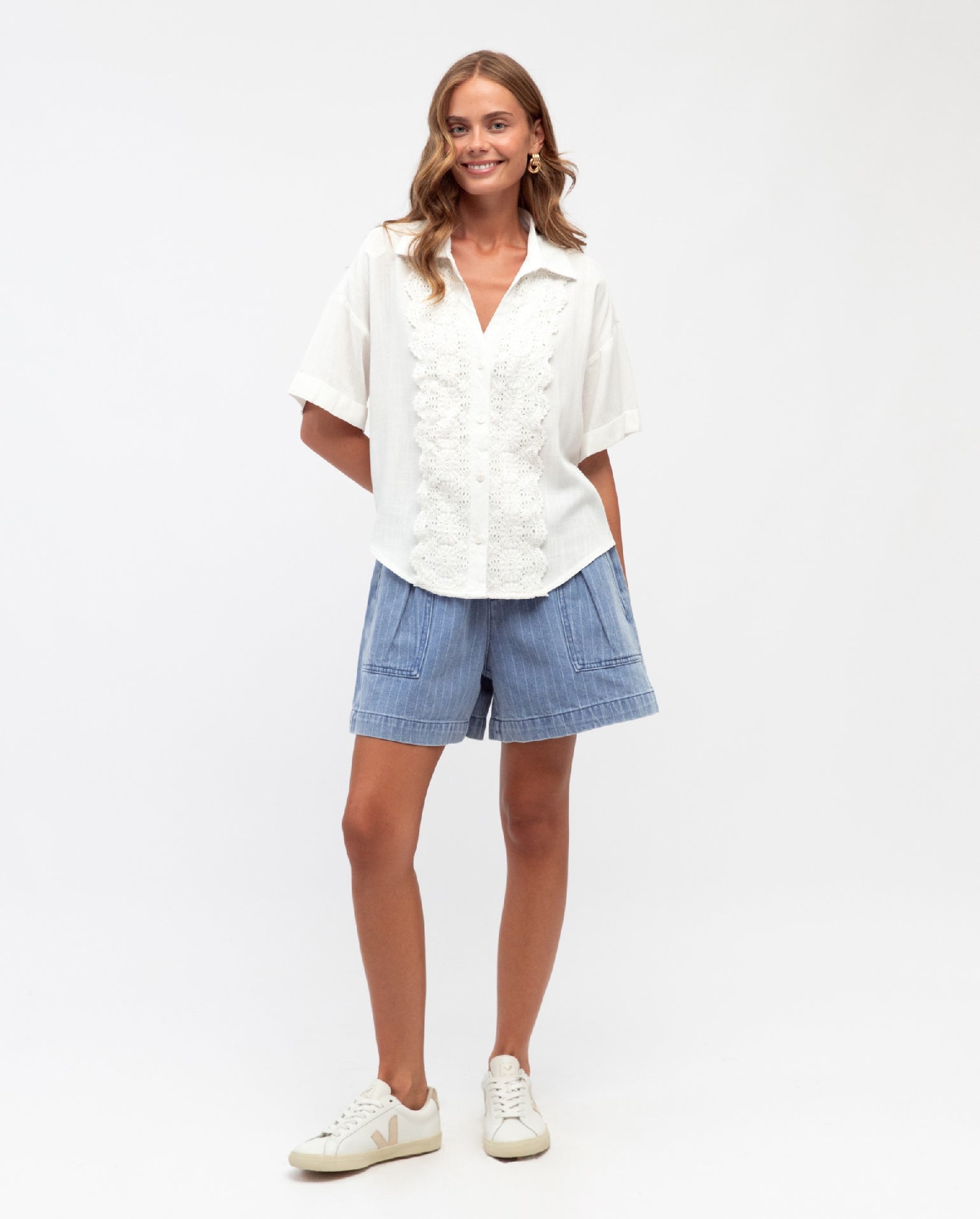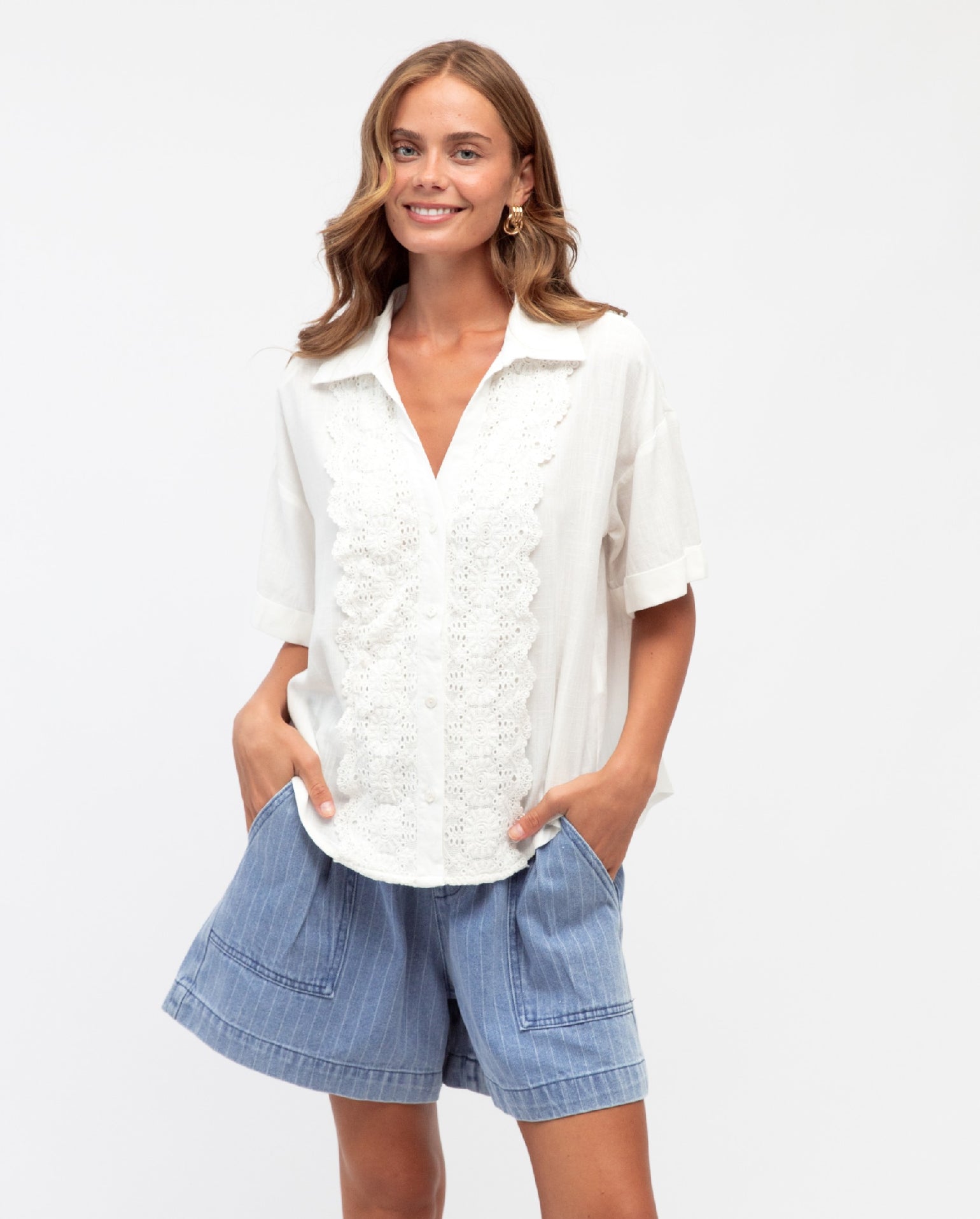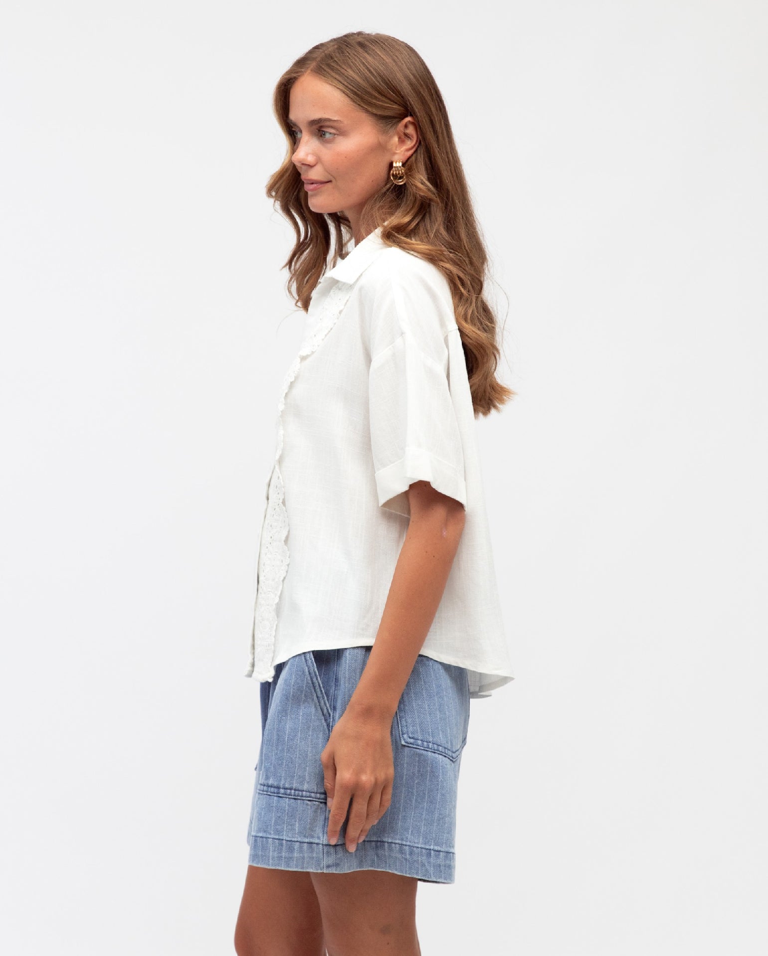 The Alyssa Shirt is a unique design, that you can wear year after year! It features a collared neckline, a centre front button closure and short sleeves with a rolled hem. It is finished in a linen blend fabrication, showcasing a white hue and a lace trim detail along the centre front. Oversized in nature with a curved hemline.