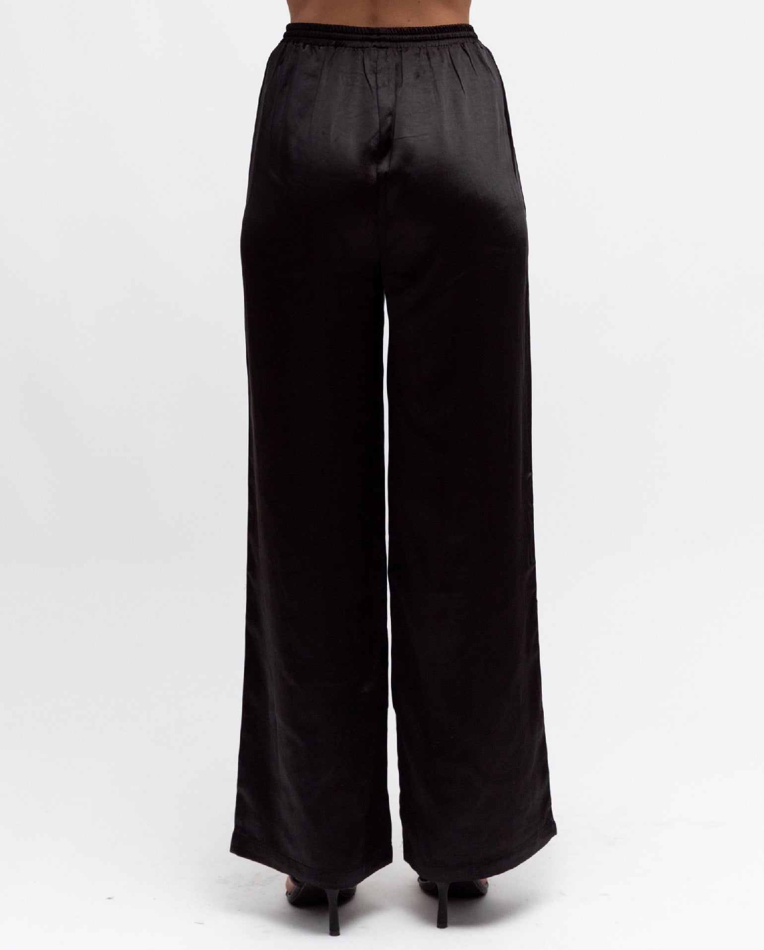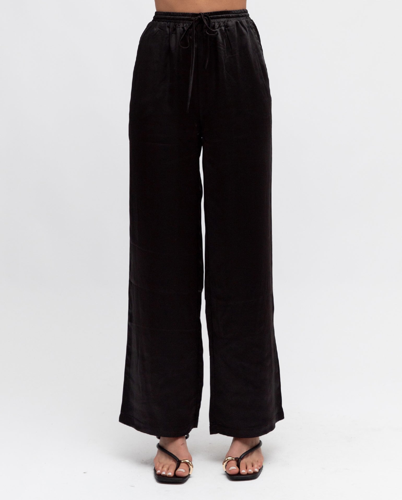 The Dean Pant are a classic design, that you can wear all year long! They are a comfortable fit in a satin look fabrication, showcasing a stunning black hue. High waisted in nature that feature a draw string waist and side pockets. Full length, wide leg design.