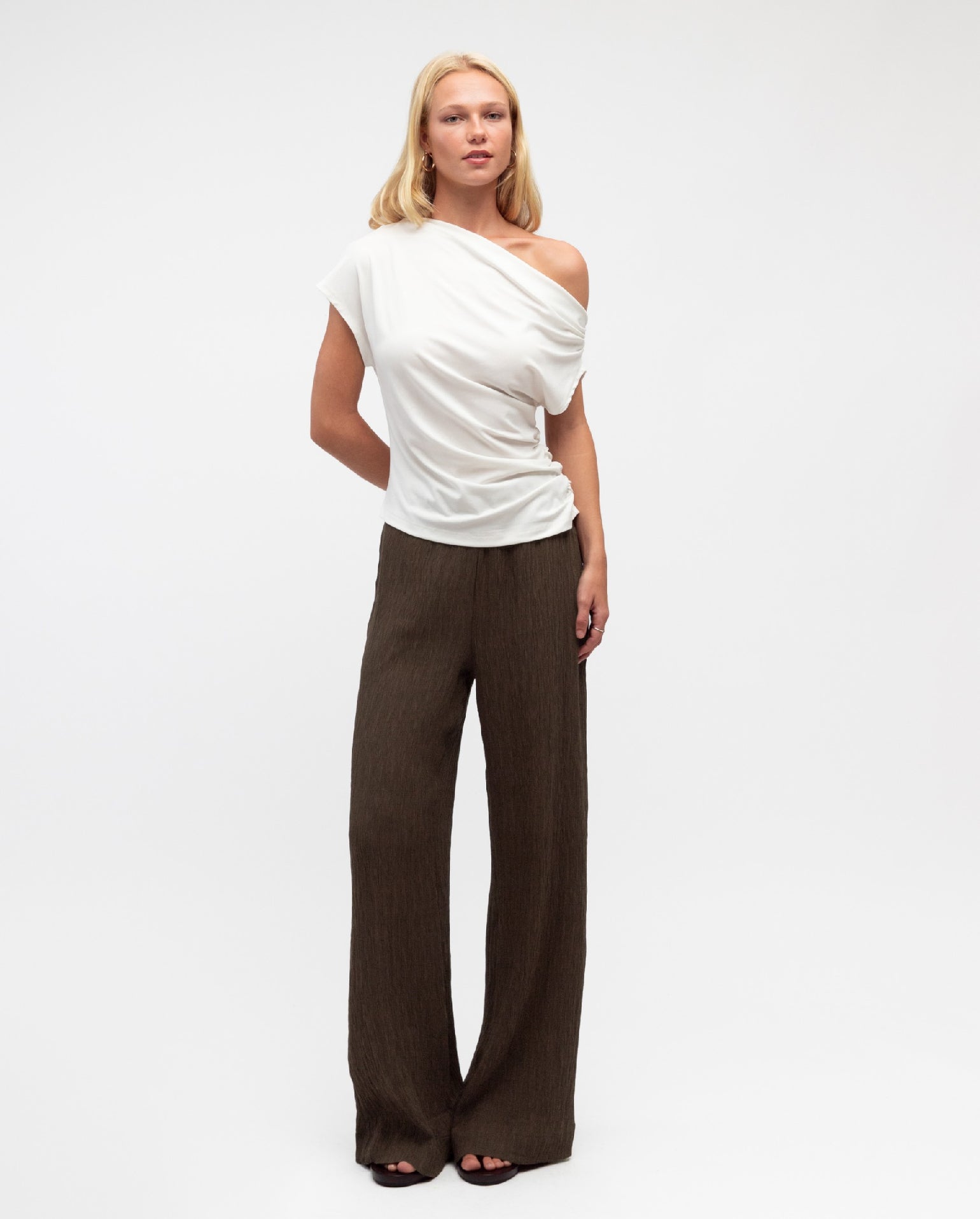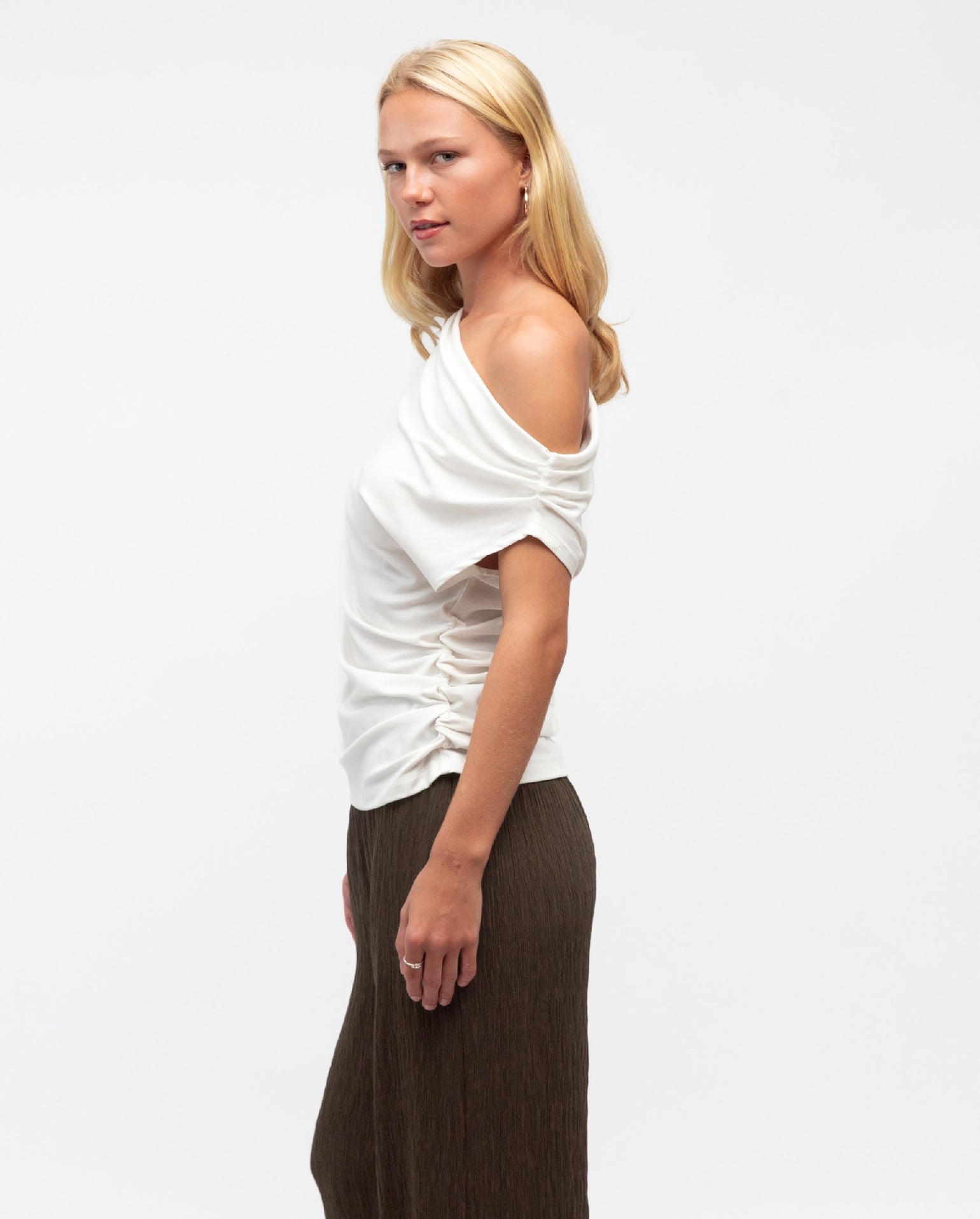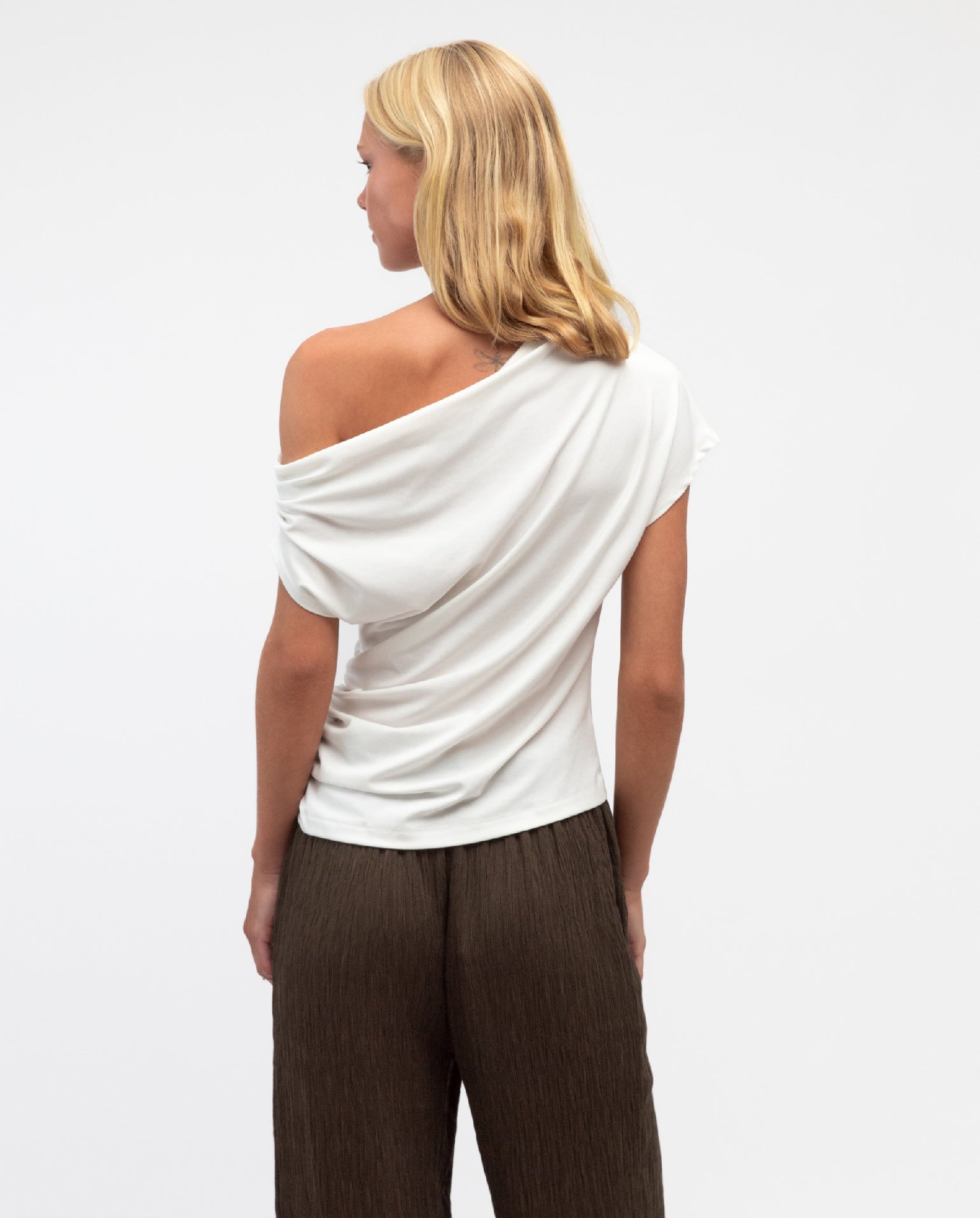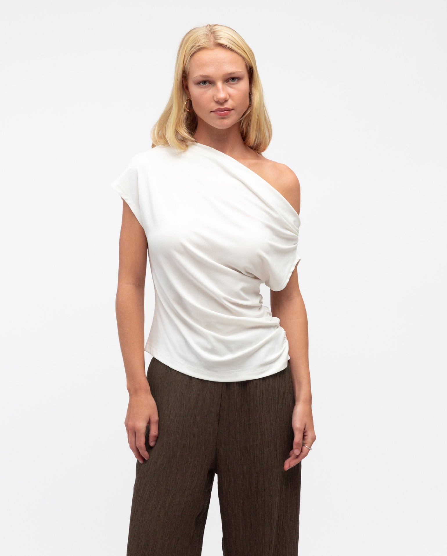 The Diane Top is a minimal design, with so much versatility! It is finished in a stretch jersey fabrication, that showcases a soft white hue. It features a one shoulder, draped neckline with a cinched in waistline. Straight hemline. Pair back with a high waisted flare pant to complete the look!