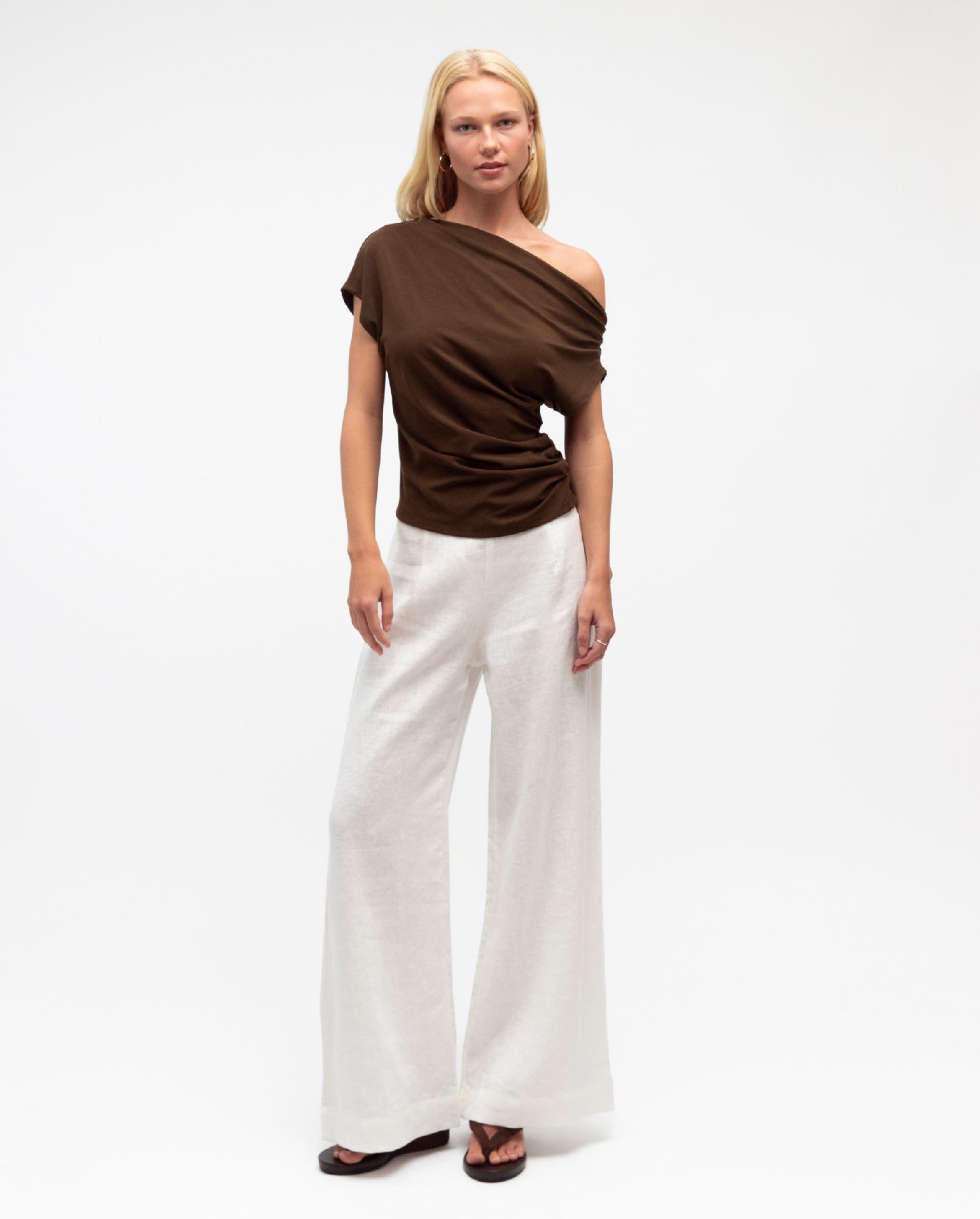 The Diane Top is a minimal design, with so much versatility! It is finished in a stretch jersey fabrication, that showcases a soft chocolate hue. It features a one shoulder, draped neckline with a cinched in waistline. Straight hemline. Pair back with a high waisted flare pant to complete the look!