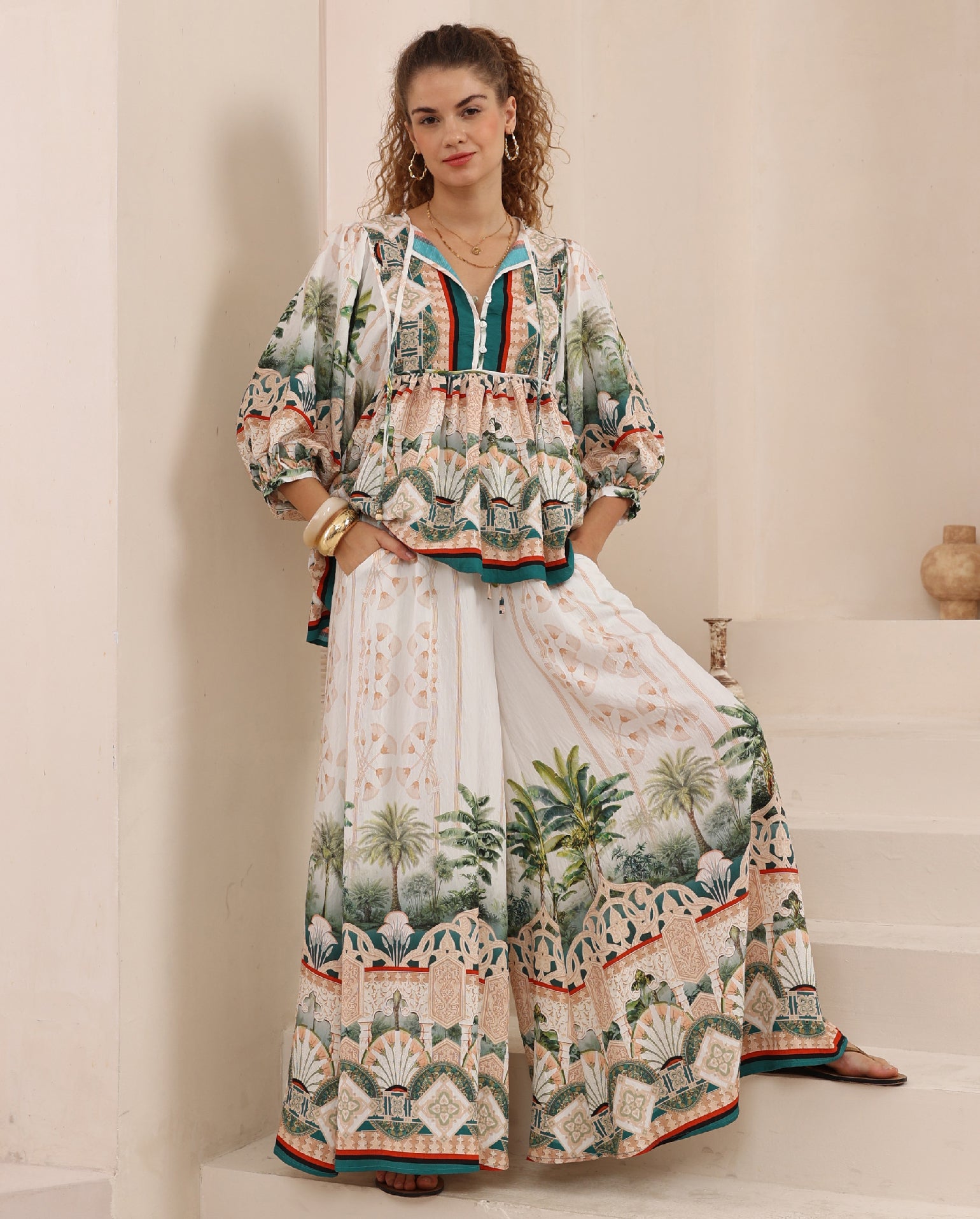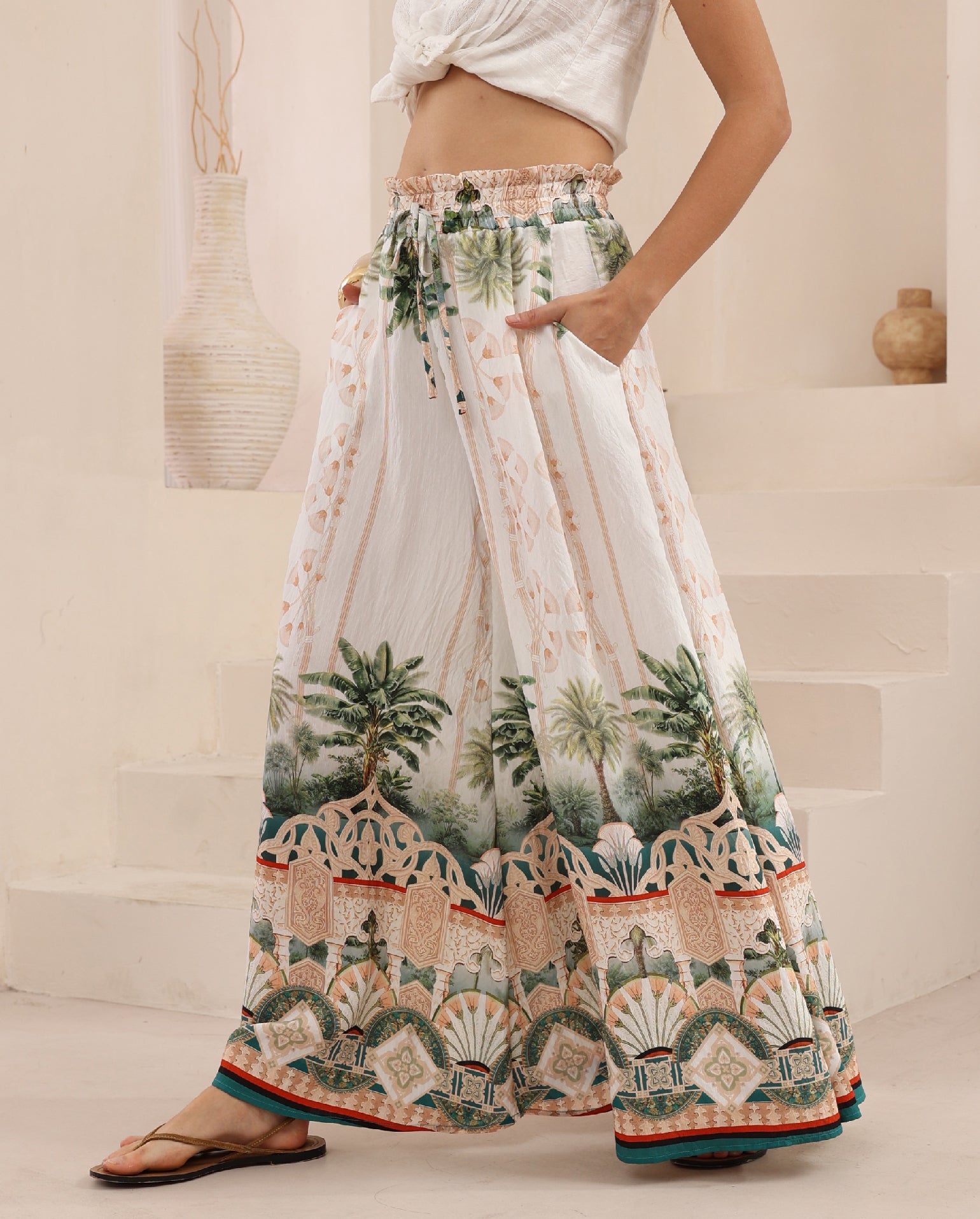 The Mowgli Pant are a fun design, that will become your go-to this summer! They are a breezy fit in a light weight fabrication, showcasing a stunning 'jungle' inspired placement print. High waisted in nature that feature a thick elasticised waist band and draw string. Full length, exaggerated wide leg design with side pockets. Pair back with our Newtown Top to complete the look!