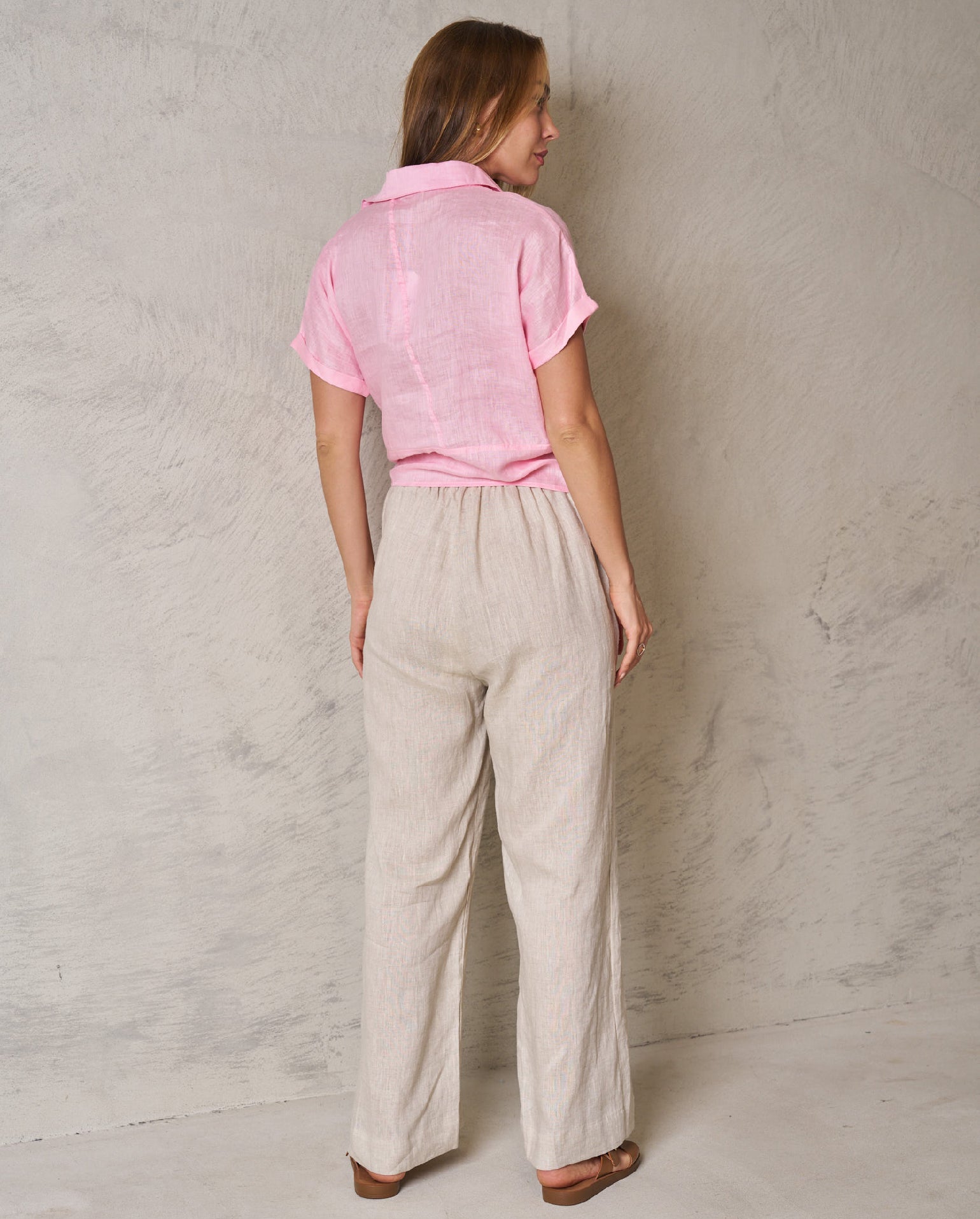 The Newtown Top is the ultimate comfort piece, that will never date! It features an open v-neckline and a classic collar design. Roomy off body design with short breezy sleeves. Finished in 100% Linen, it showcases a stunning pink hue. Straight hemline with a unique tie detail at the side.