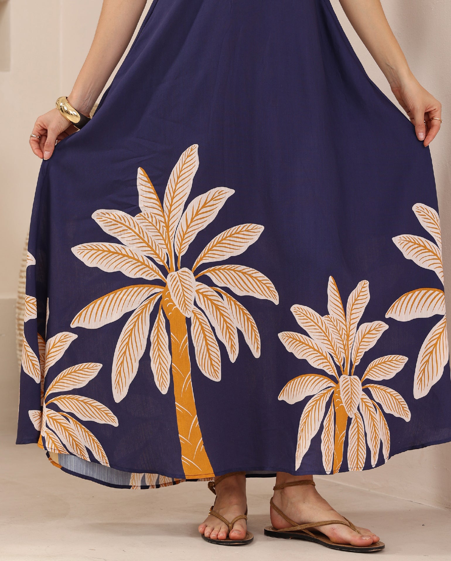 Stay on trend this summer in our Palma Dress! It is finished in a light weight fabrication, showcasing a stunning palm tree placement print on a midnight blue base. It features a square neckline, an elasticised back panel and thin adjustable straps. Fitted design over bust. A-line skirt design in a maxi length with side pockets. Unique bead detailing at front shoulder straps. Fully lined bust panel.