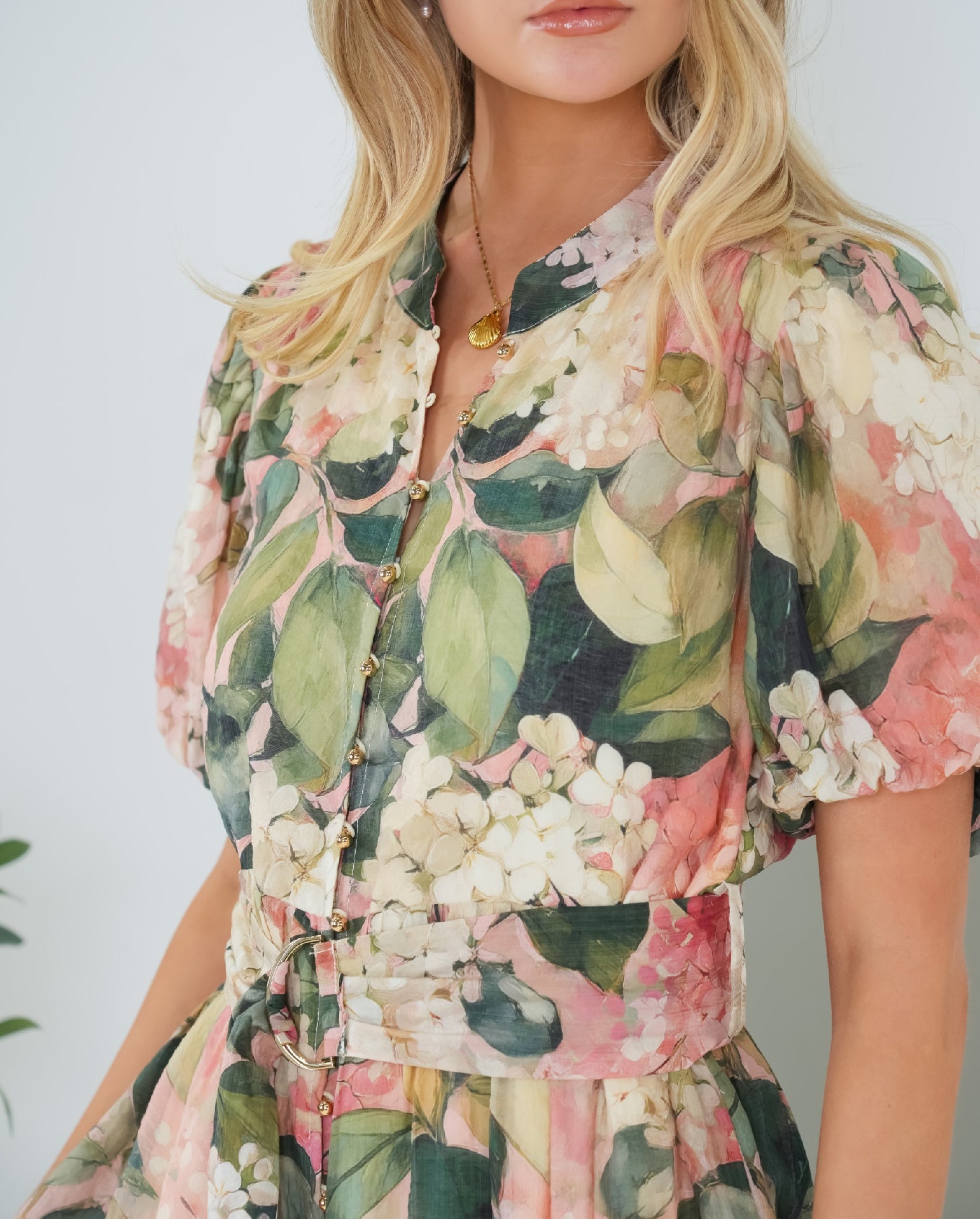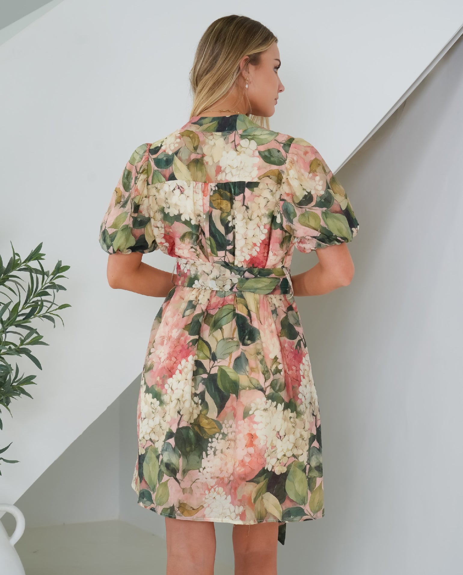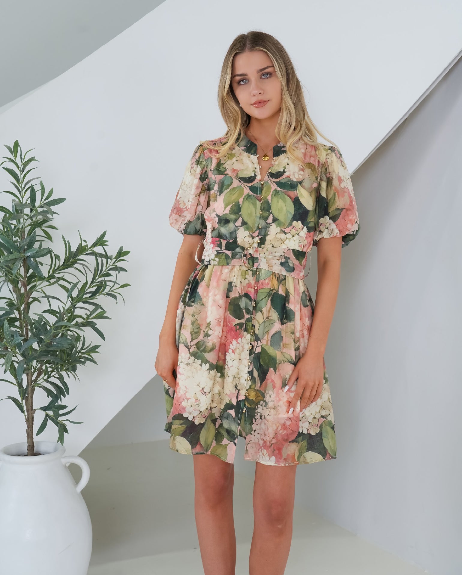 The Sakura Dress is the perfect dress for the upcoming event season! It features a mandarin collar, a centre front button closure and short balloon sleeves. Light weight fabrication that showcases a stunning vintage floral print in shades of green, beige and rust. Off body design in a short length, that can be cinched in at the waist with the included belt. Fully lined garment.