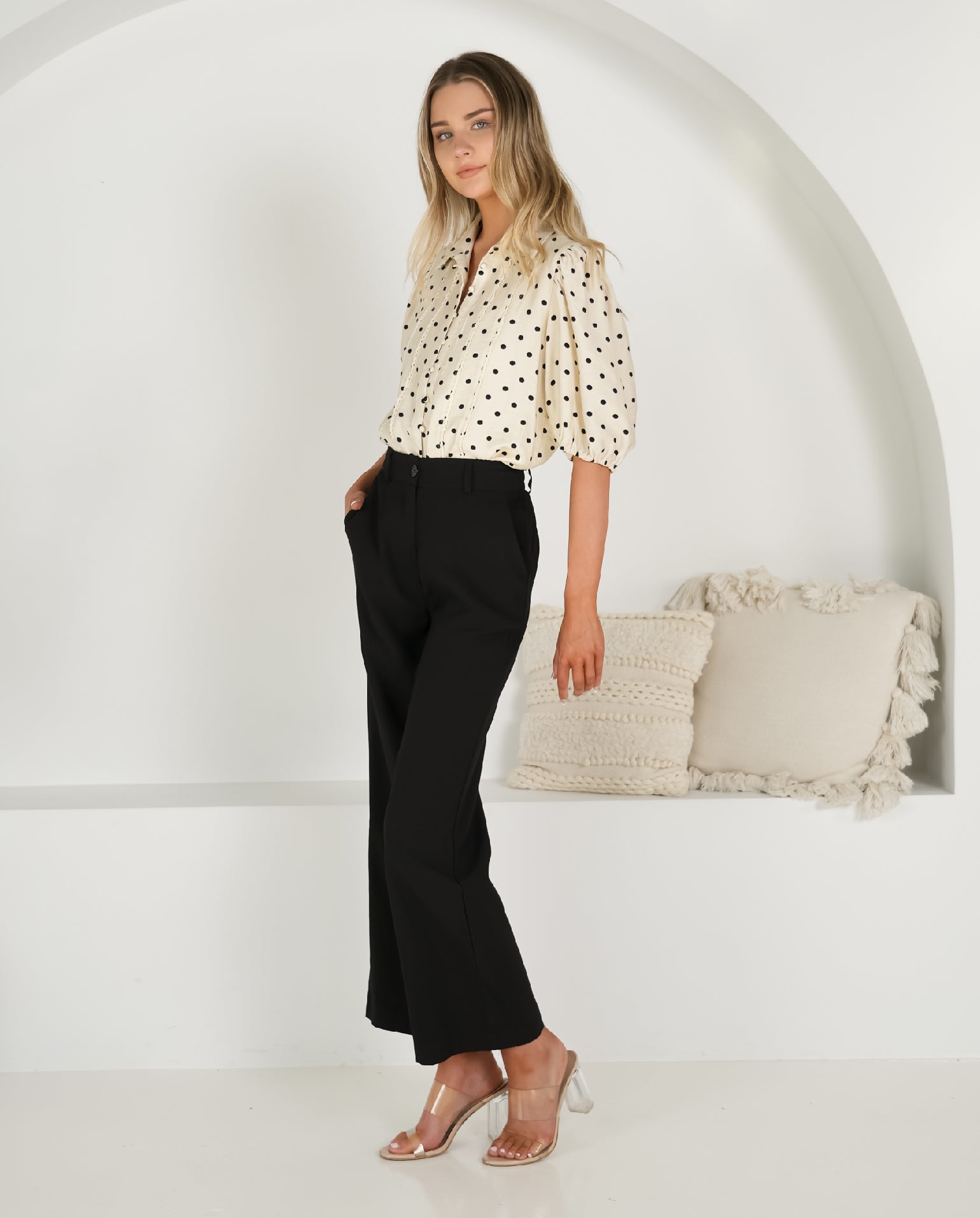 The Sonnet Blouse is a versatile piece, that can take you from the office to a night out! It features a classic collar design, a centre front button closure and short sleeves with elasticised cuffs. It is finished in a light weight fabrication that showcases a polka dot print in shades of black and cream. Unique lace trim detail along centre front button closure. Comfortable, off body design with a curved hemline.