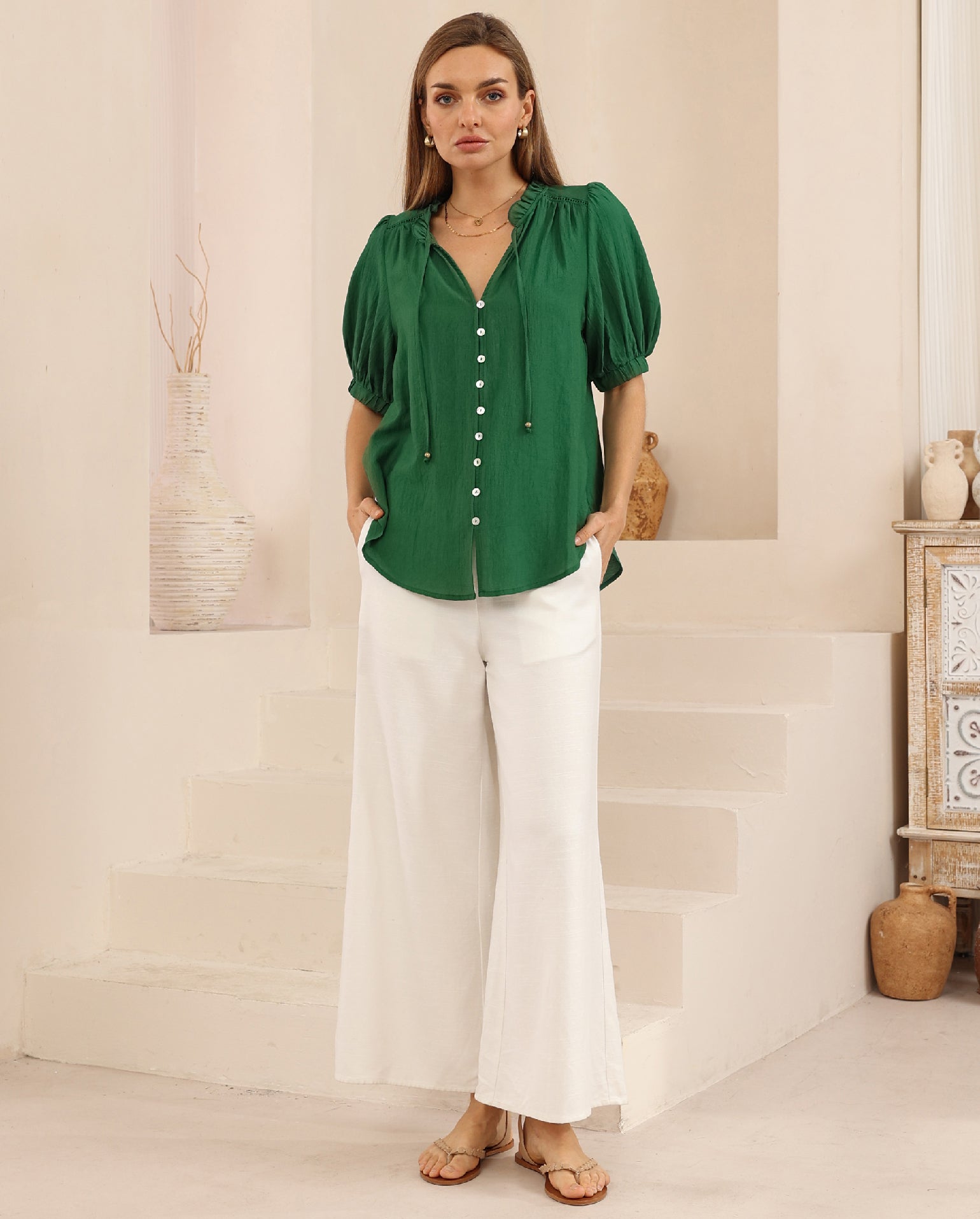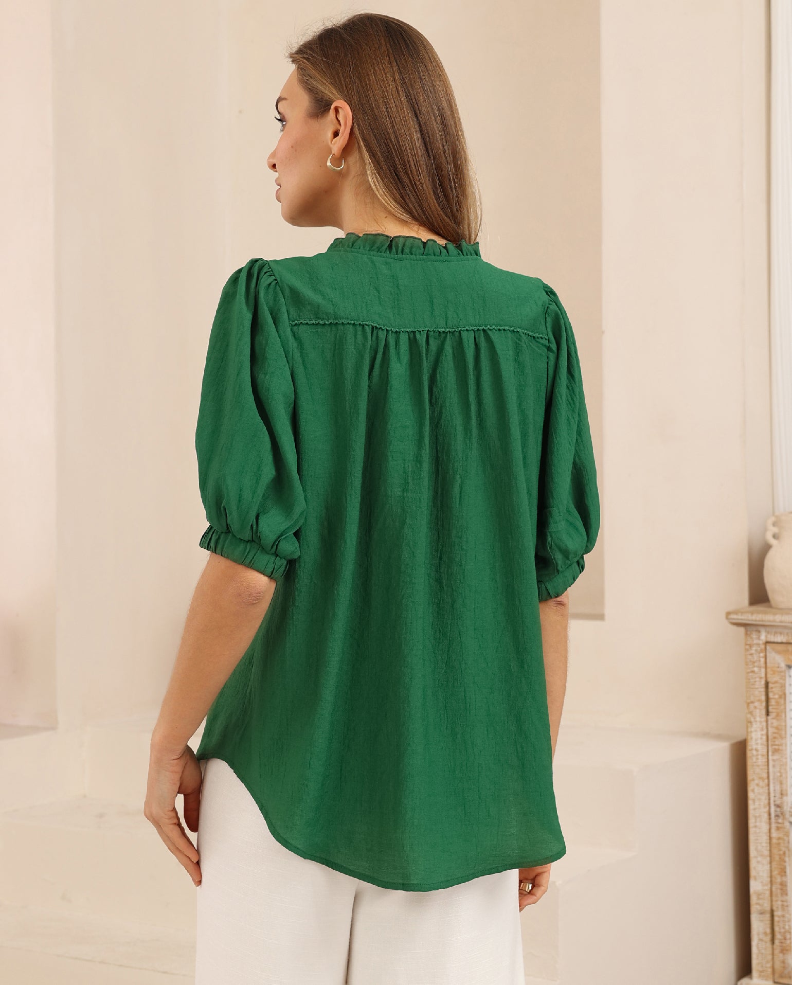The Sue Blouse is the perfect summer piece that can take you from the office to a night out! It features a gathered collar design with a delicate tie and a button closure down the centre front. Short breezy sleeves, with thick elasticised cuffs. It is finished in a light weight fabrication, showcasing a stunning green hue. Comfortable, off body design with a scooped hemline.
