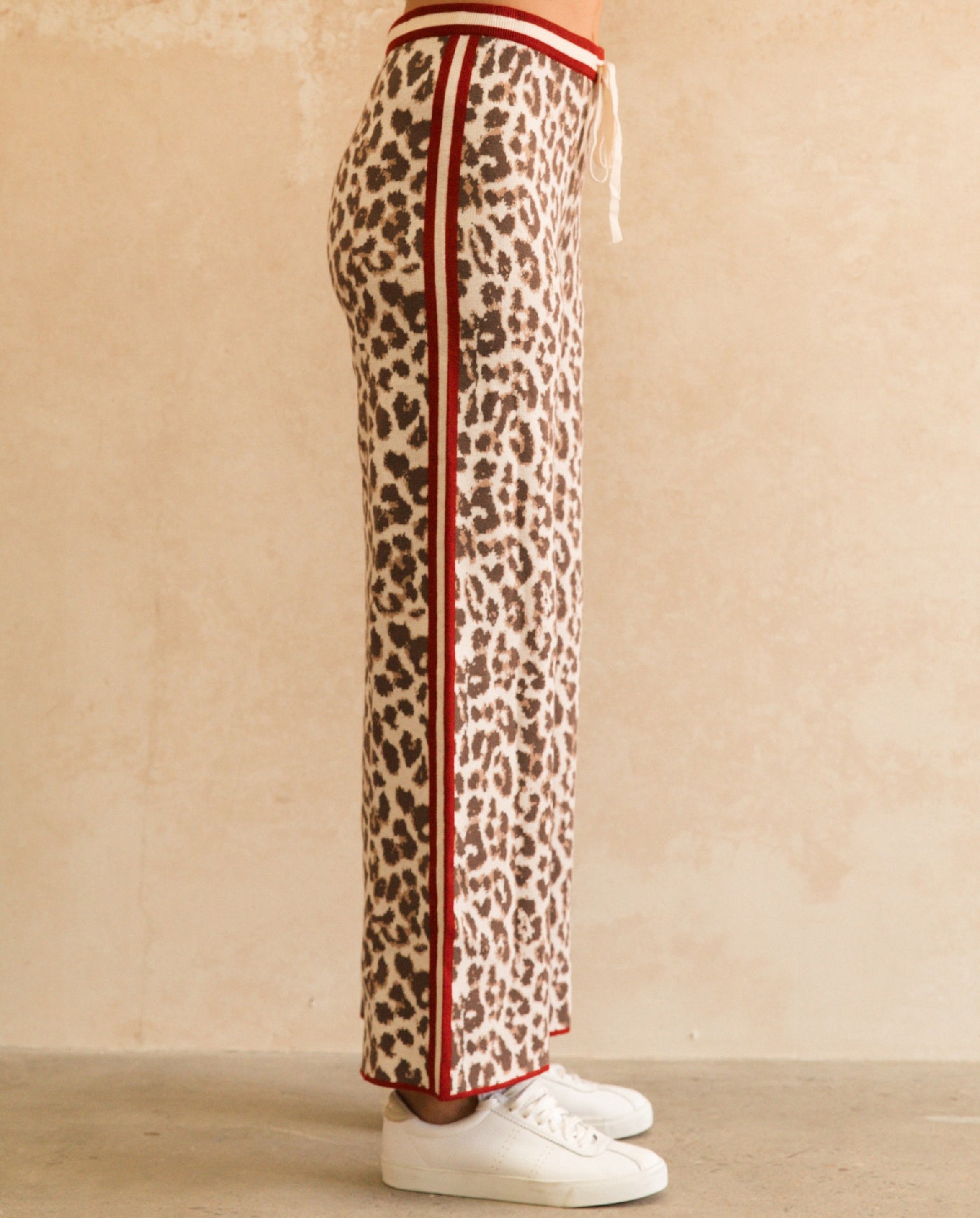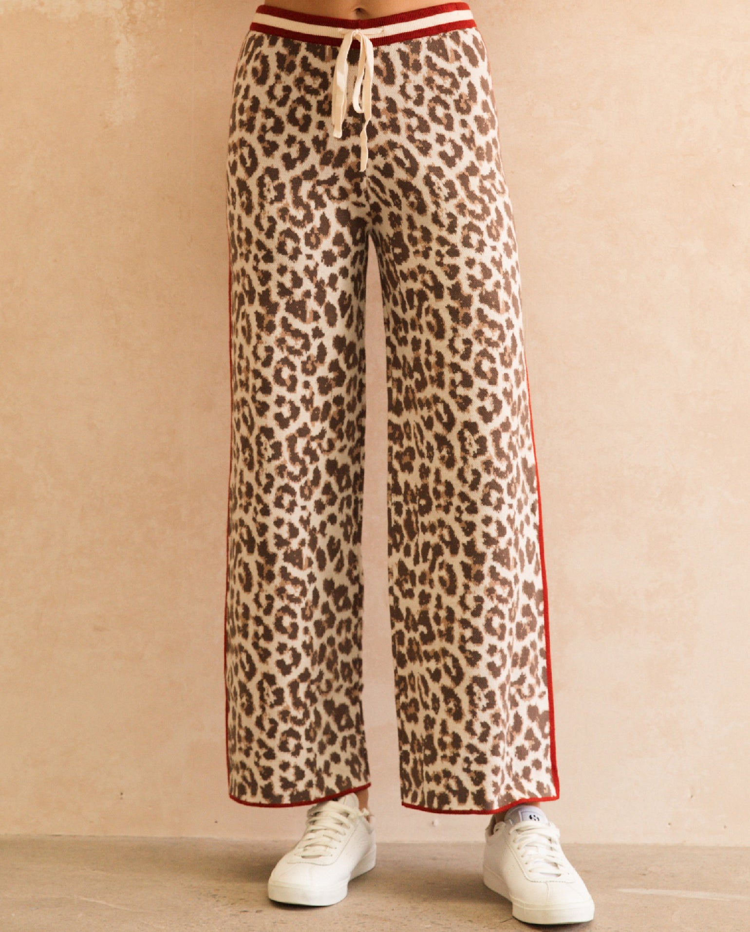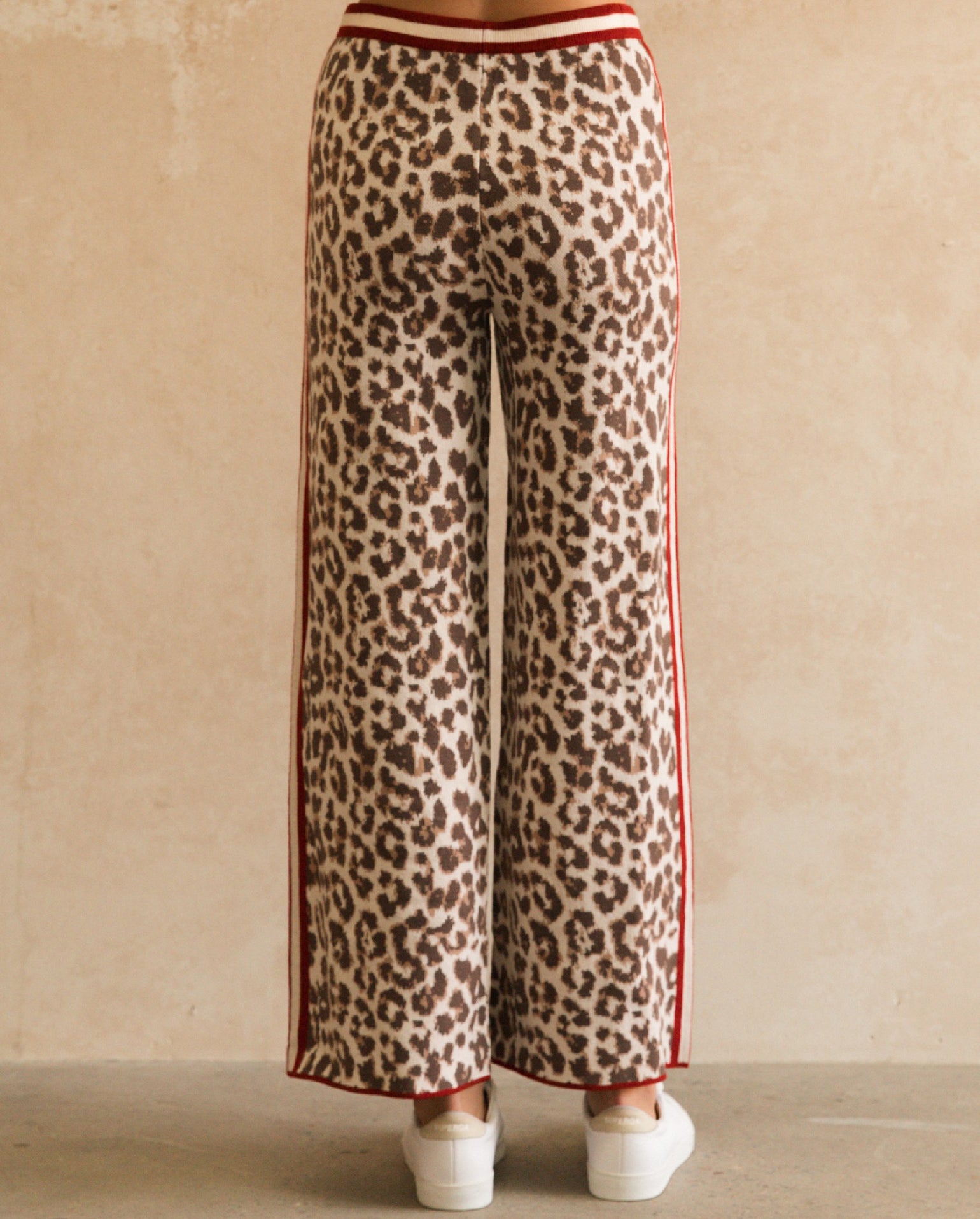 The Bagheera Knit Pant are a quirky design, that you'll wear all Winter long! They are a comfortable fit in stretch knit fabrication, showcasing a leopard print design with a red and beige contrast stripe throughout. High waisted in nature that feature an elasticised drawstring waist band. Full length, wide leg design. Pair back with our Bagheera Cardigan to complete the look!