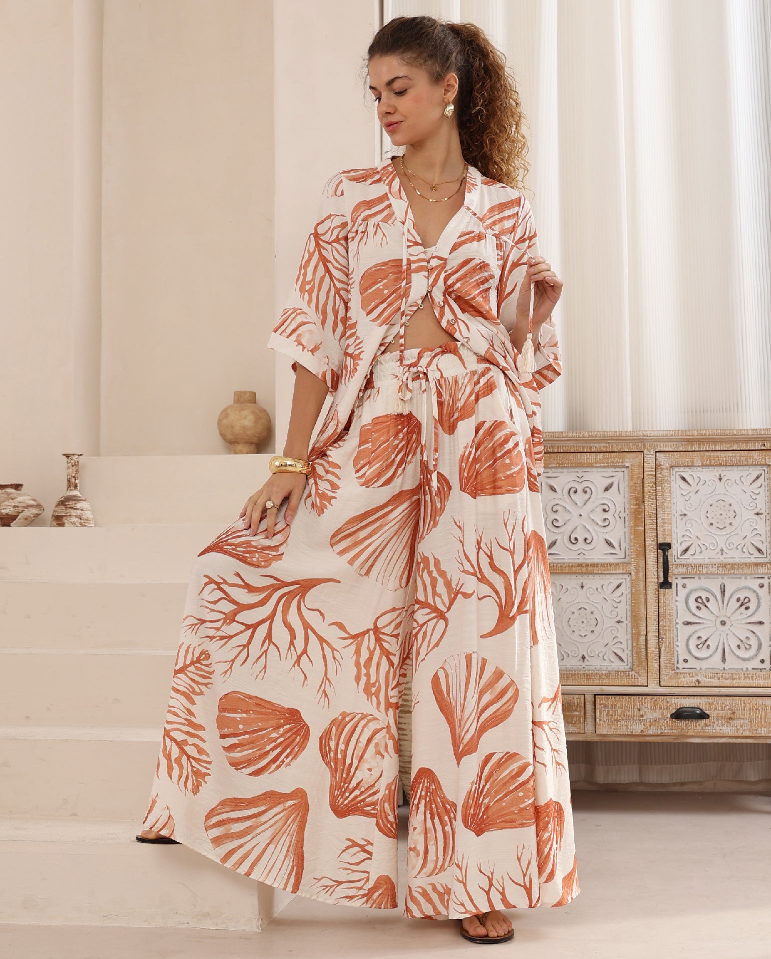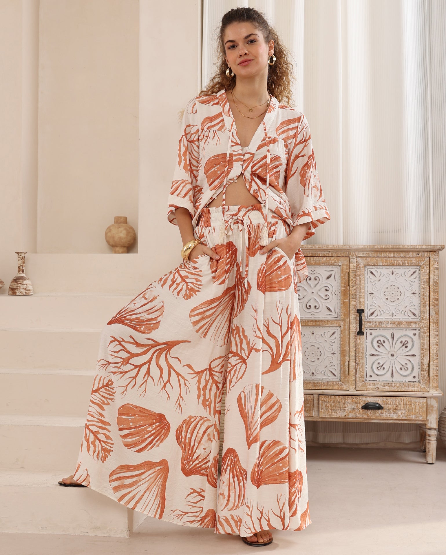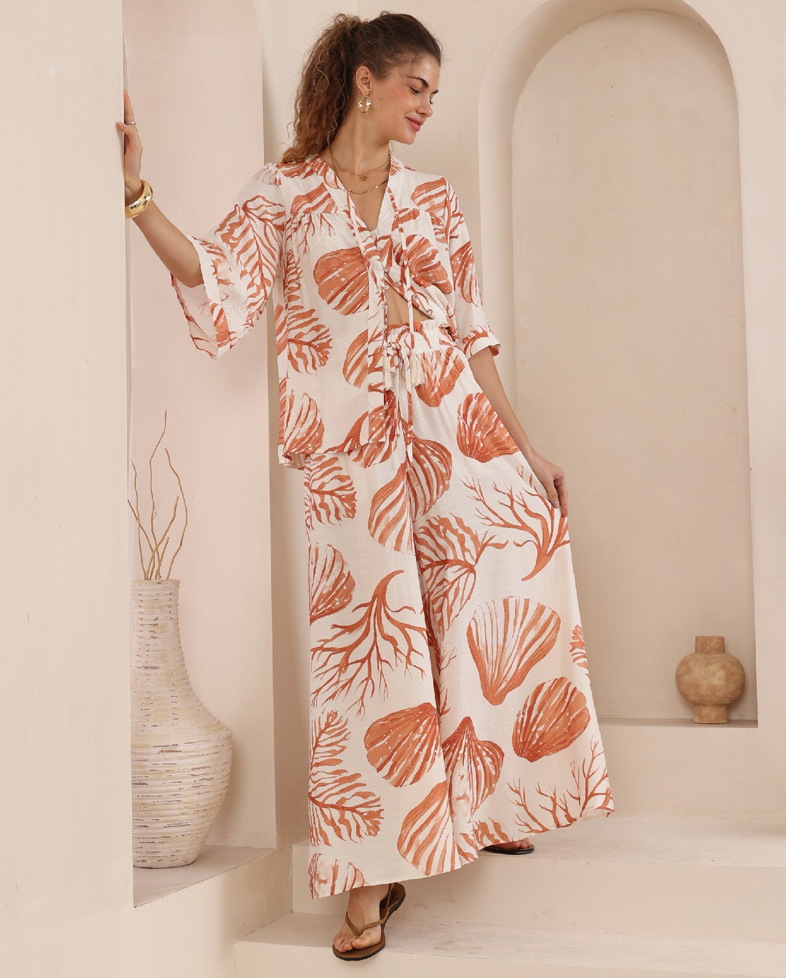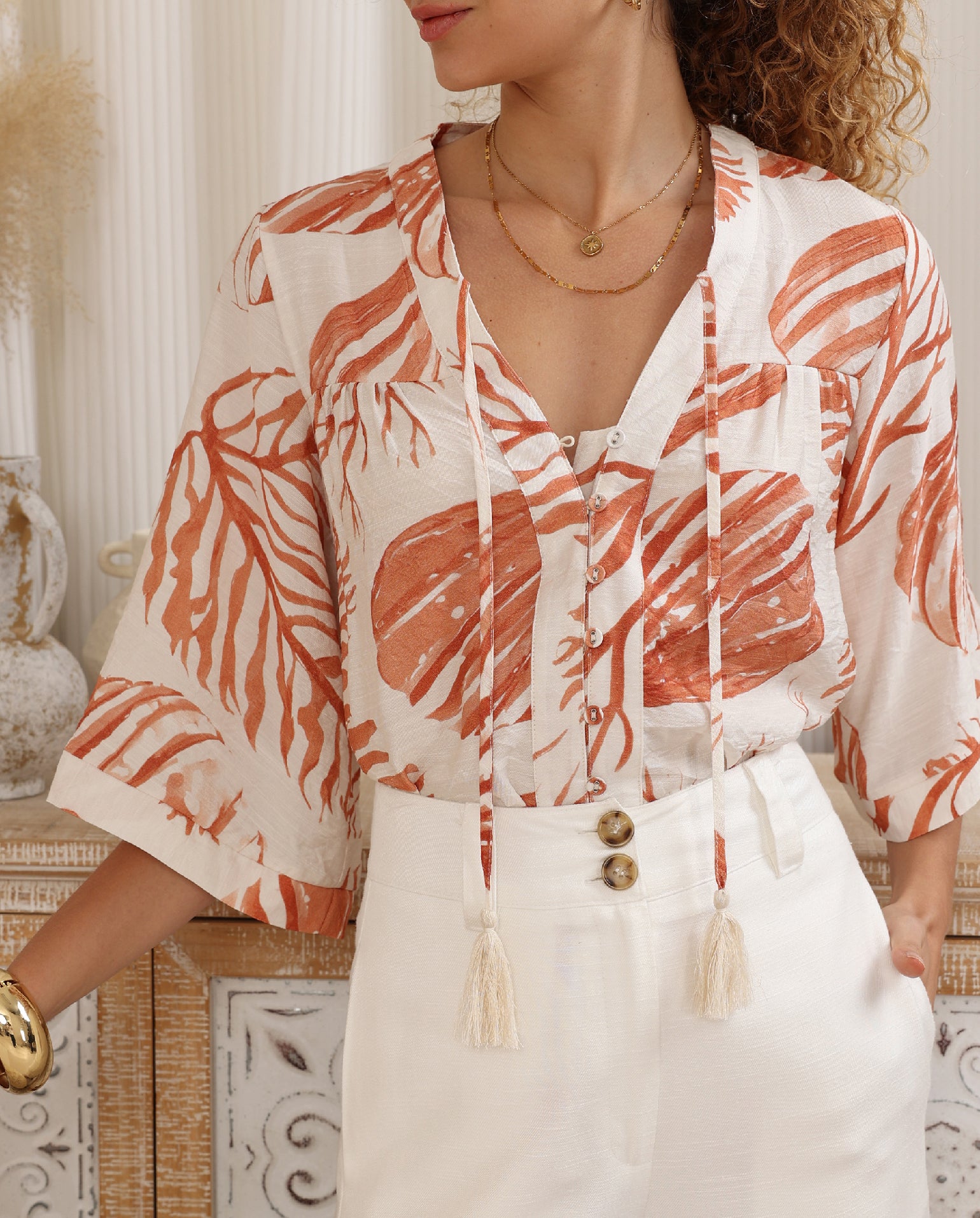 The Flounder Blouse is the perfect summer piece that can take you from the office to a night out! It features a v-neckline with a delicate tie and a centre front button closure. It is finished in a light weight fabrication, showcasing a stunning 'Sea' inspired print in shades of white and rust. Comfortable, off body design with short breezy sleeves and a straight hemline. Pair back with our Flounder Pant to complete the look!
