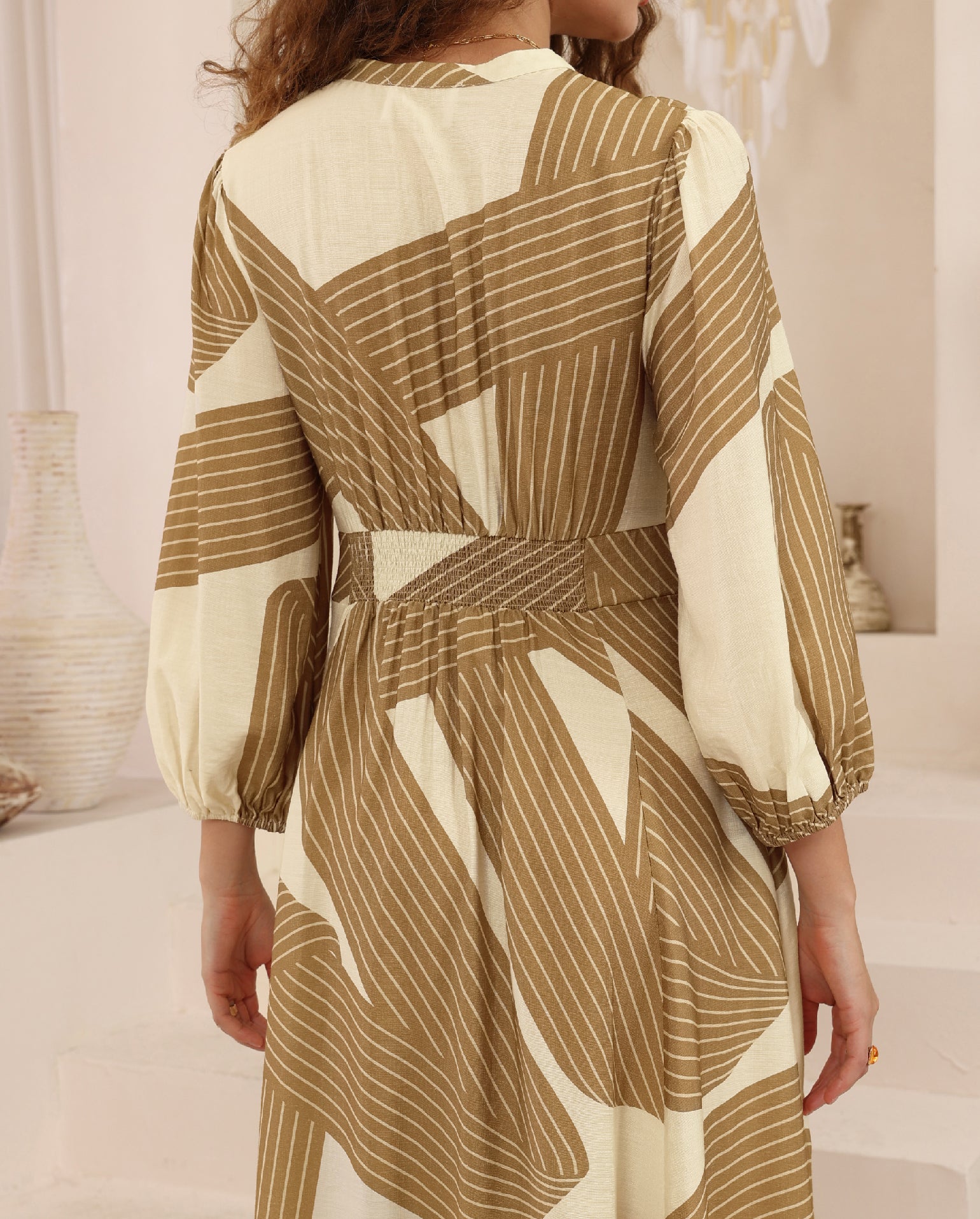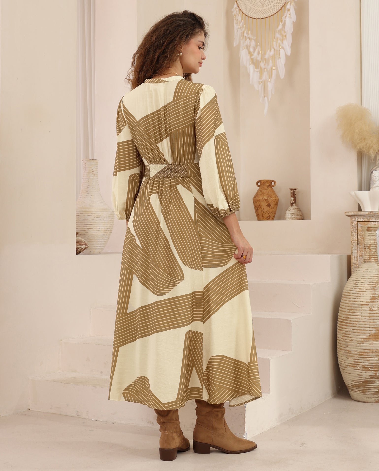 The Weri Dress is a statement must-have for your winter wardrobe! It is finished in a light weight fabrication, showcasing a stunning swirl abstract print in shades of tan and ivory. It features a mandarin collar, a centre front button closure and full length sleeves with thin elasticised cuffs. The dress has a belt sewn into the side seams, that can be styled to the front or back. Elasticised back panel at waistline. Midi length skirt, straight hemline.