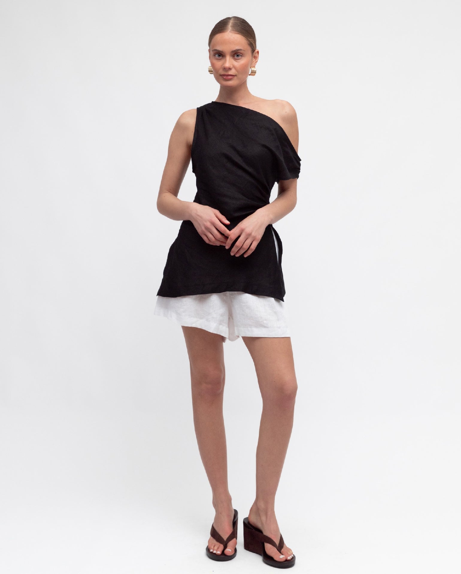 The Callie Top is a minimal design, with so much versatility! It is finished in a 100% linen fabrication, that showcases a deep black hue. It features a one shoulder, draped neckline with a cinched in waistline. Asymmetric hemline with a side split and an invisible side zip closure. Pair back with a high waisted flare pant to complete the look!