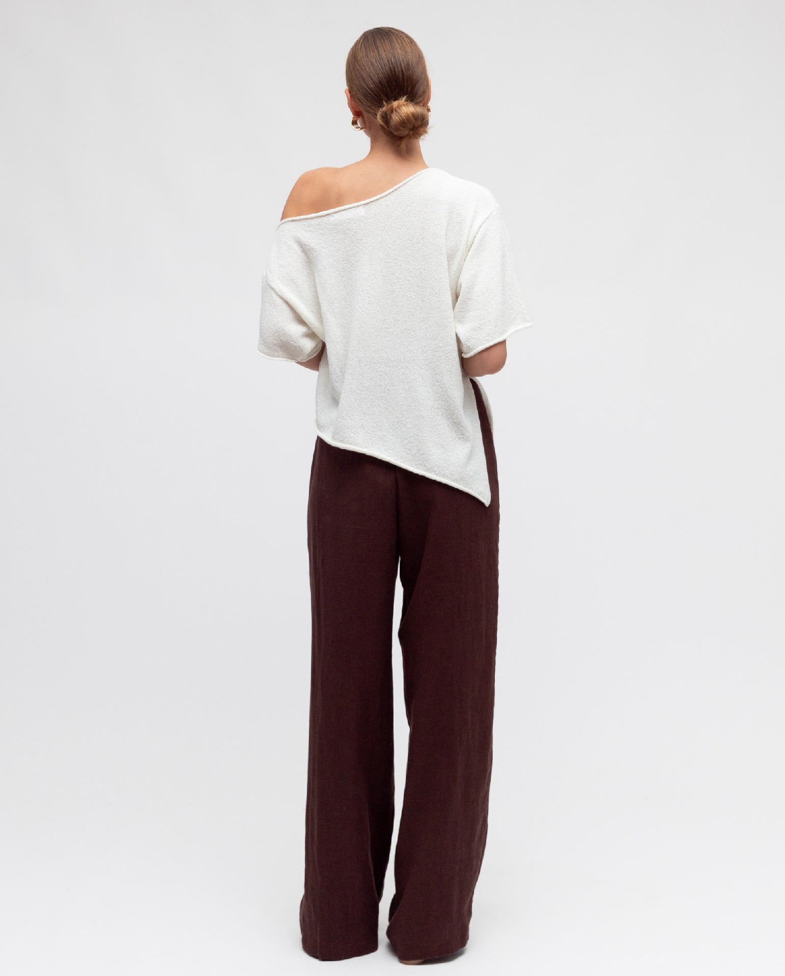 The Gabriella Top is a minimal design, with so much versatility! It is finished in a thin knit fabrication, that showcases a soft white hue. Off body fit that has a draped, one shoulder design. Asymmetric hemline with a side split at the hemline. Pair back with a high waisted flare short to complete the look!