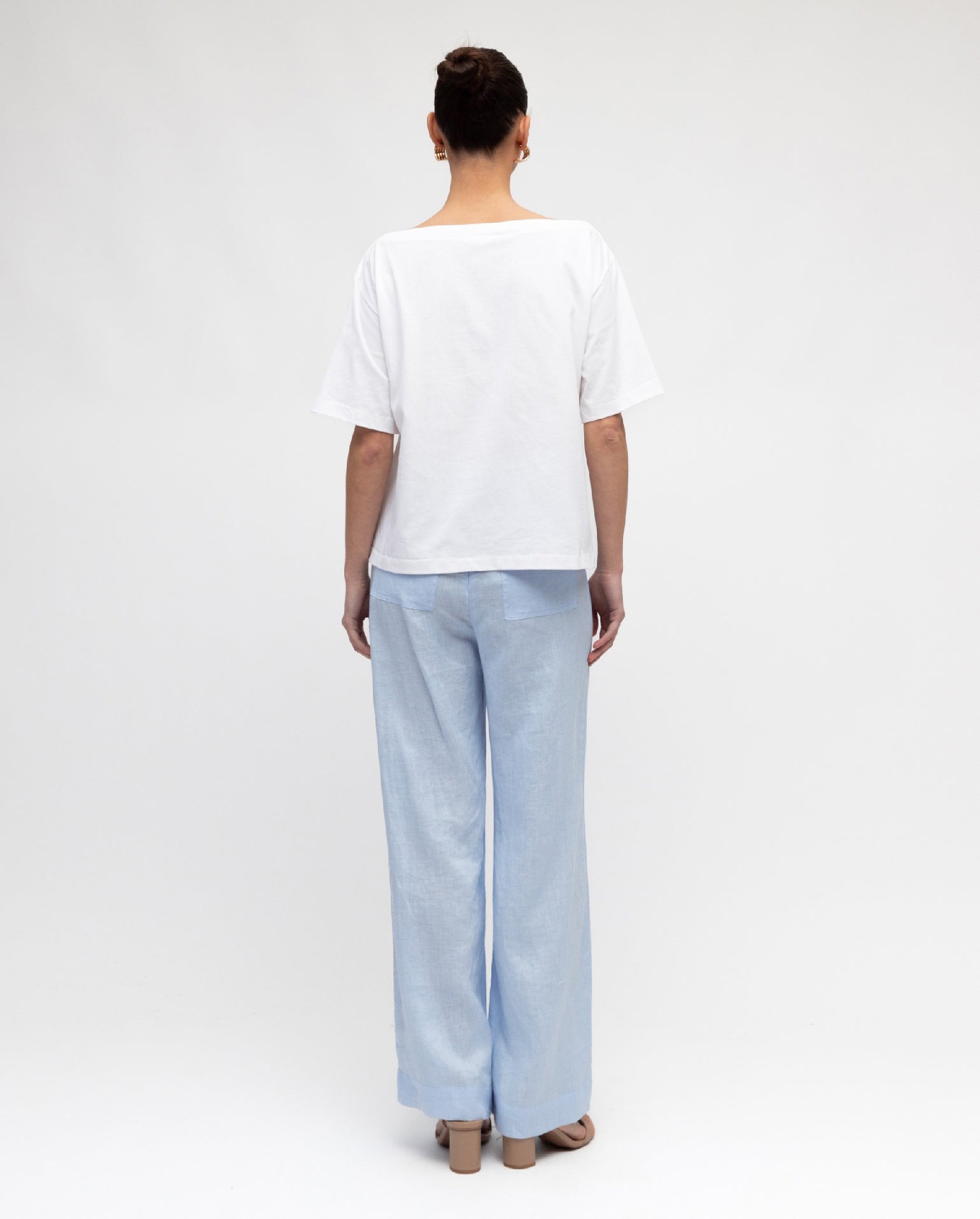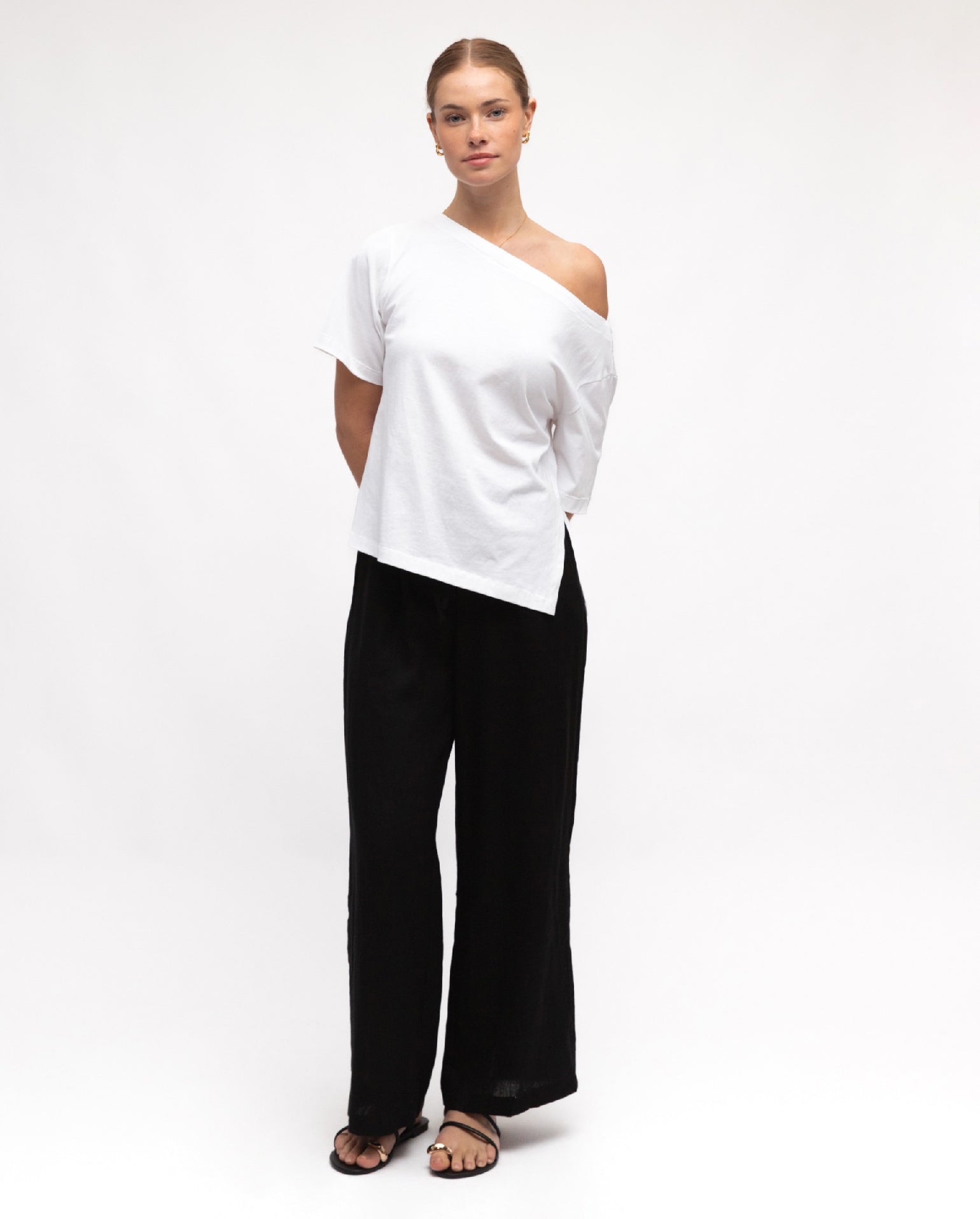 The Nicki T-Shirt is a minimal design, with so much versatility! It is finished in a 100% cotton fabrication, that showcases a soft white hue. Off body fit that has a draped, one shoulder design. Asymmetric hemline with a side split at the hemline. Pair back with a high waisted flare pant to complete the look!