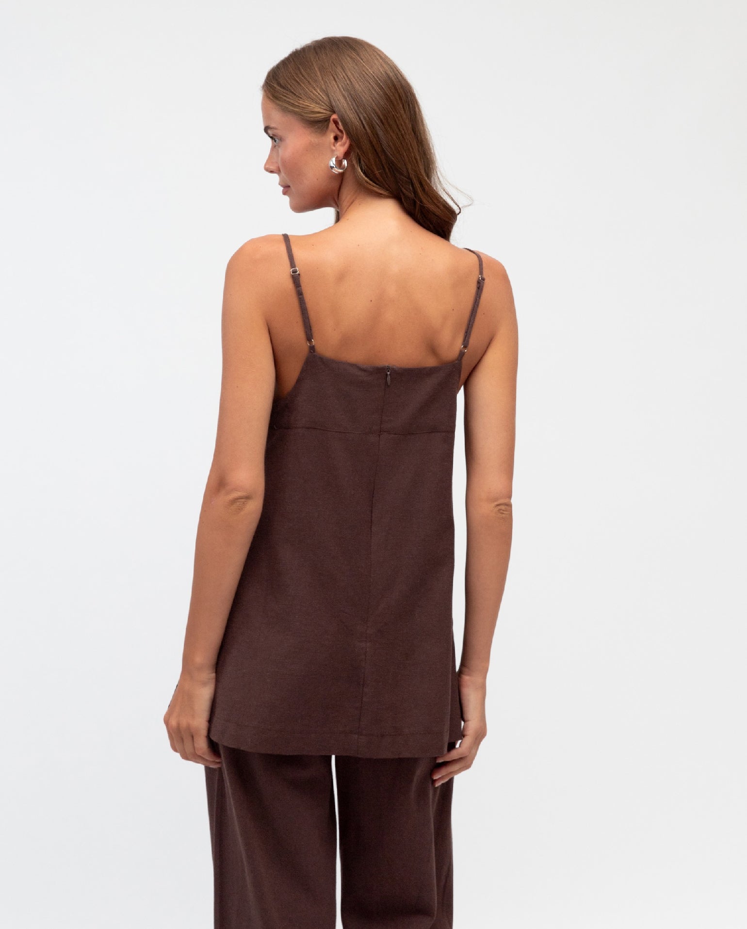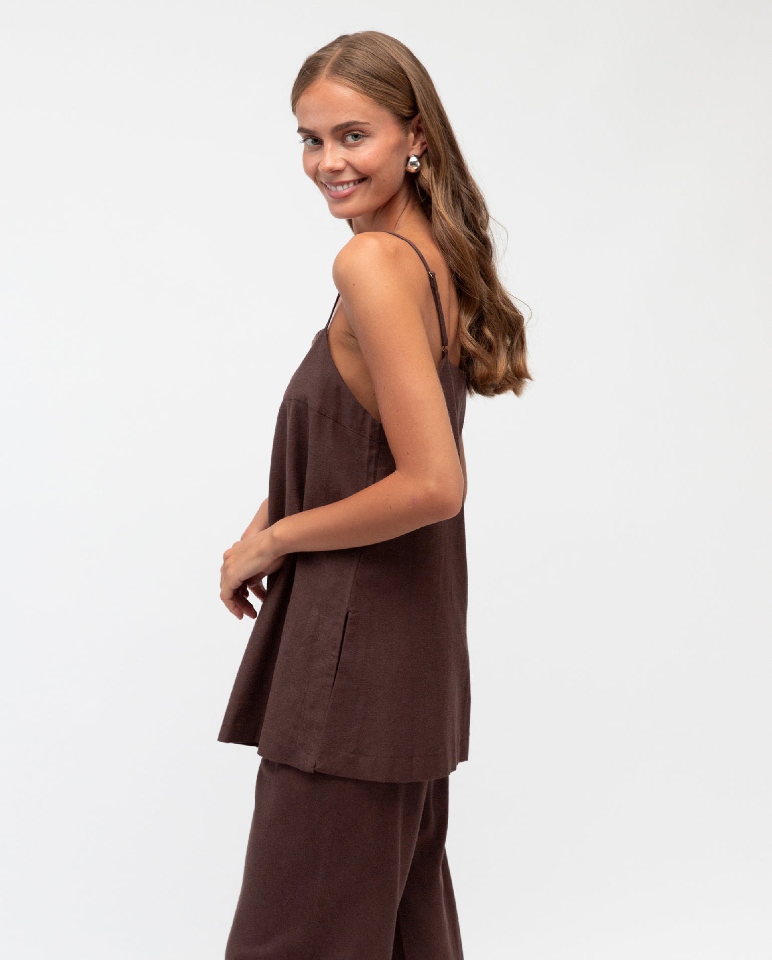 The Vega Top is a classic design with such versatility! It is finished in a linen blend fabrication, showcasing a stunning chocolate hue. It features a straight neckline and thin adjustable straps. Roomy, off body design with deep side splits. Invisible centre back zip closure. Style back with a our Vega Pant to complete the look!