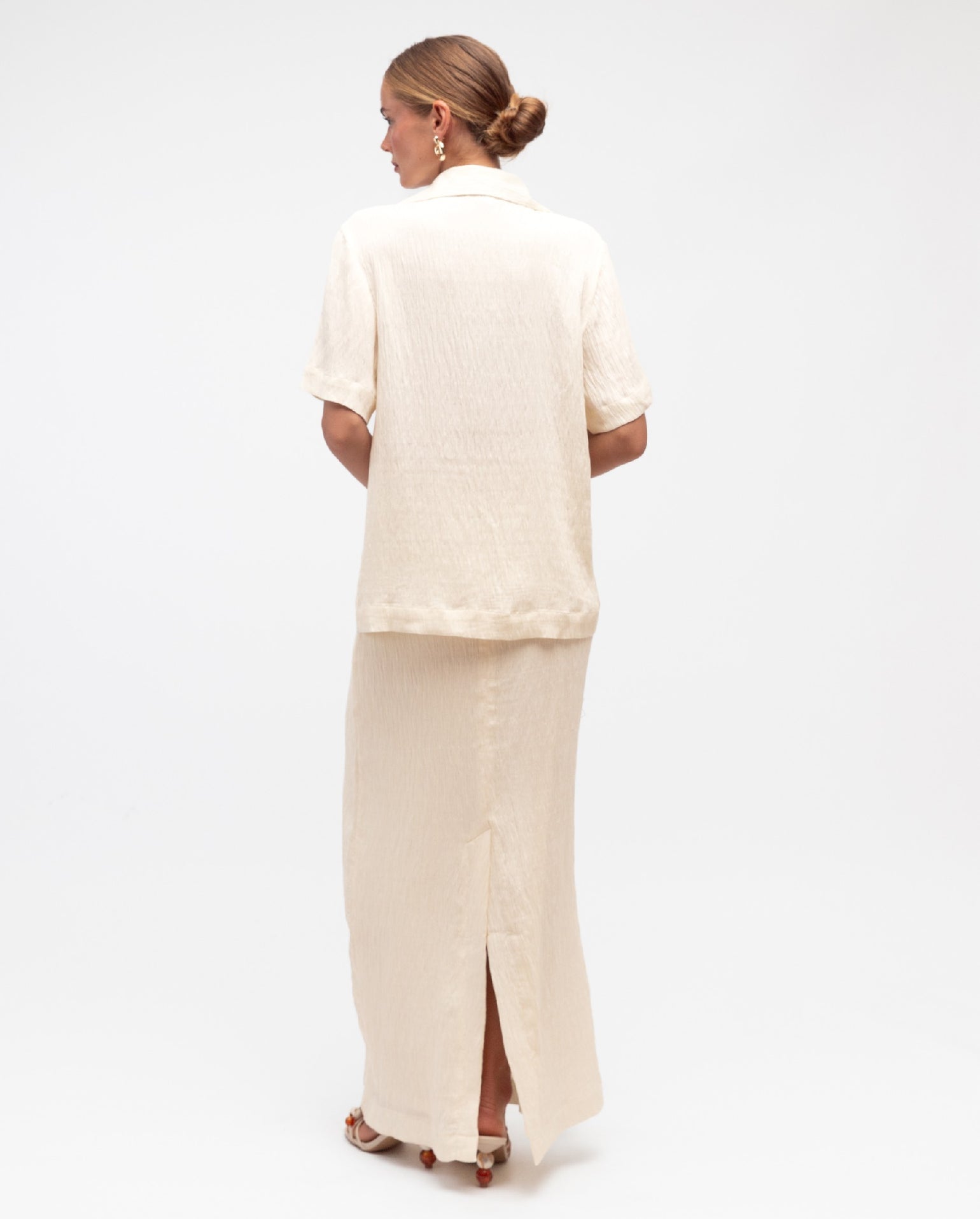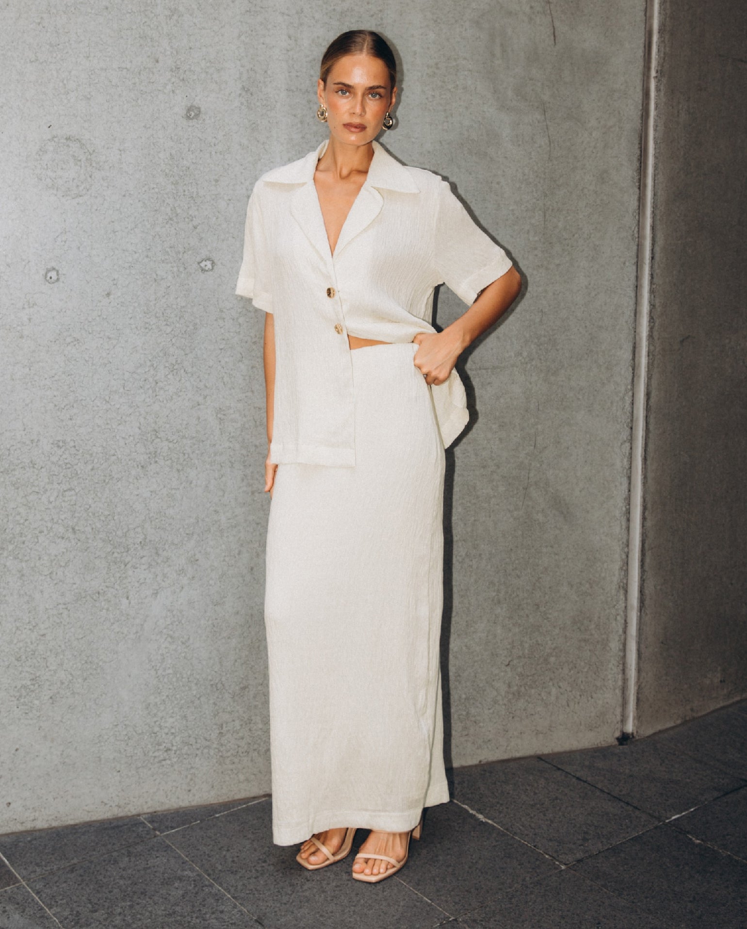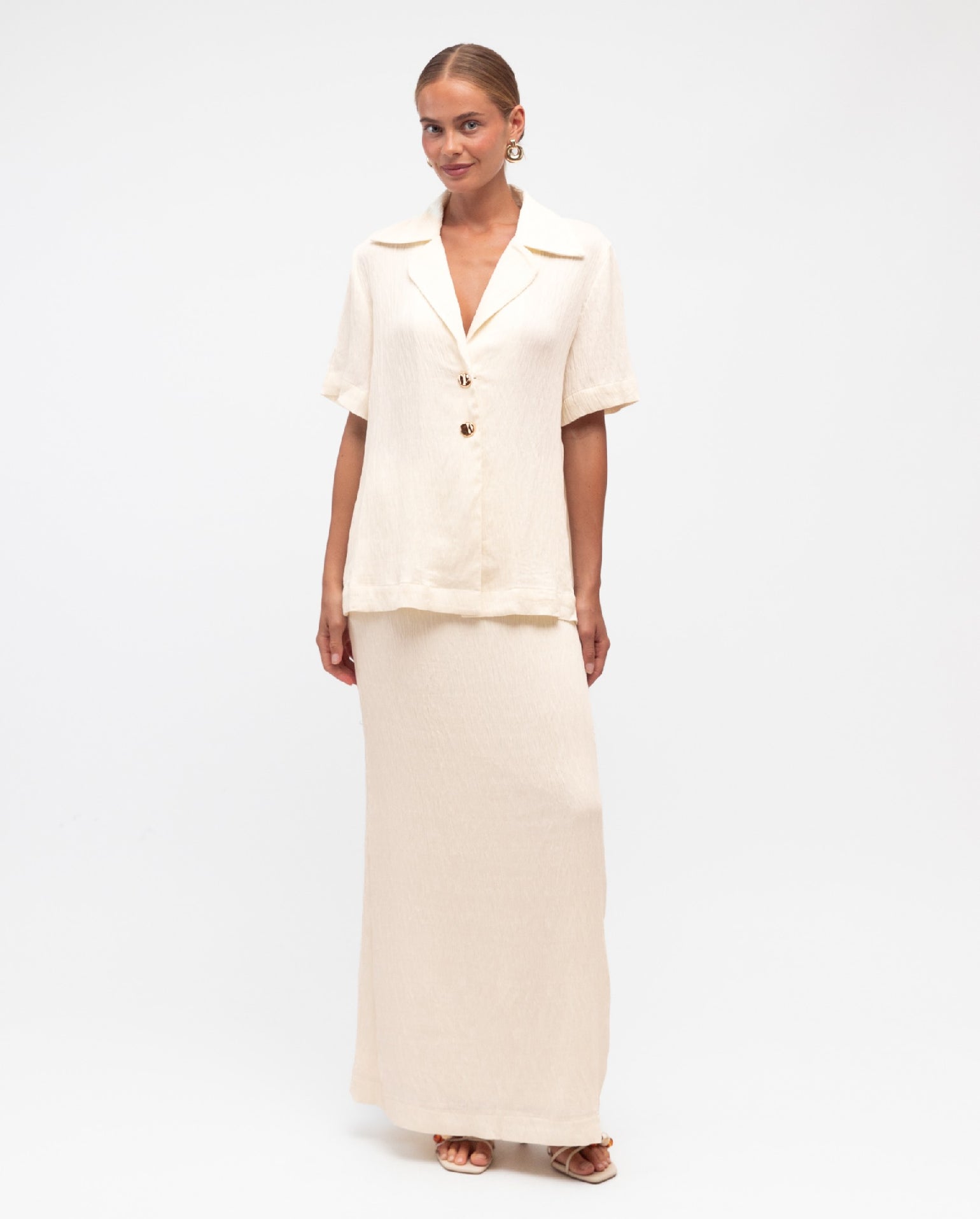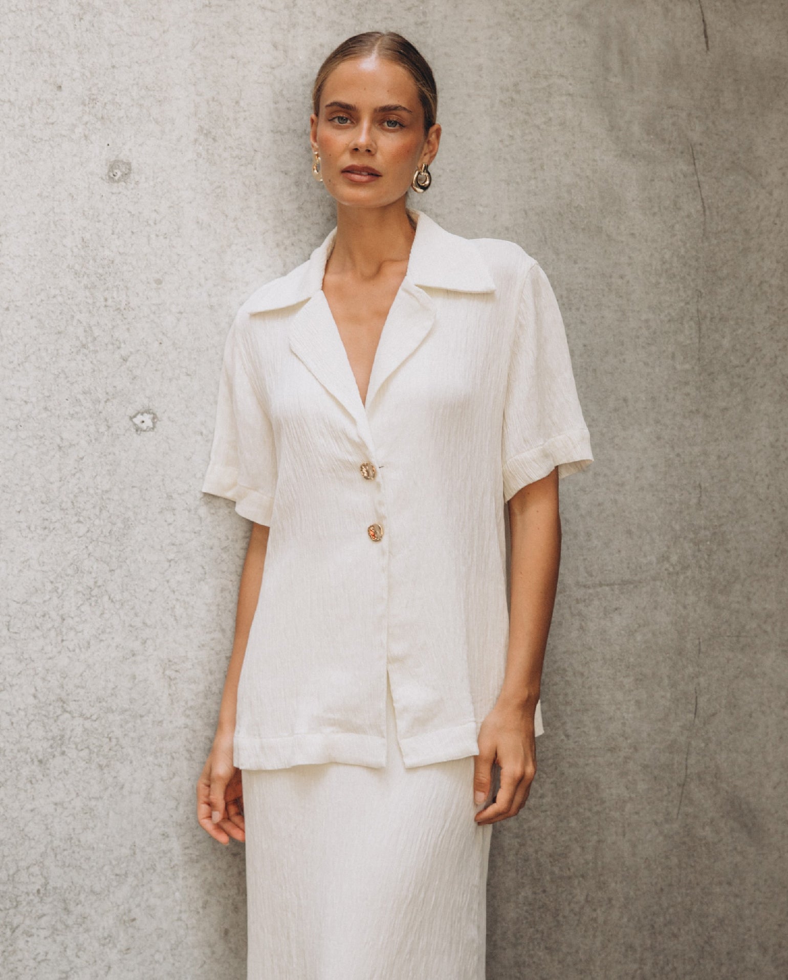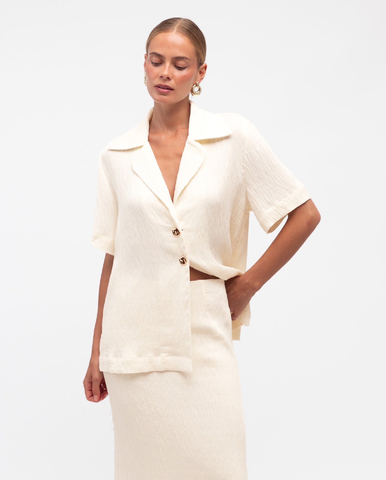 The Winona Blazer is a classic design, with so much versatility! It is finished in mid-weight textured fabrication, showcasing a stunning ivory hue. Off body design that has short sleeves, an open collared neckline and two gold centre front buttons. Straight hemline.